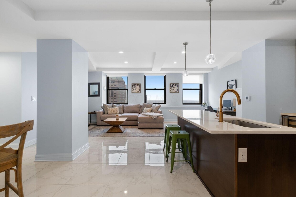 Welcome Home to your Oasis in the Heart of Downtown Columbus! Live in one of the most historic buildings in downtown,LeVeque Tower. Enter into the light filled open concept living space and kitchen,complete with stainless steel appliances,dedicated wine fridge,marble countertops,and views of the Scioto Mile and Columbus skyline. With updated flooring and closet systems,this home features 2 spacious bedrooms,both with full en suite bathrooms,and an additional half bath. The primary bedroom has a huge walk-in closet and the en suite bathroom features dual sinks,heated flooring,and tiled shower. Enjoy amenities such as 24/7 security,private entrance/elevators,on site doorman,and fitness facility. This home also provides access to Marriott amenities including room service and dry cleaning. Attached parking garage provides 2 gated and reserved parking spaces,along with the option to move into the unit fully furnished! 4-12 months lease length options. No pets,no smoking,and tenant is responsible for utility costs. Close to all that downtown Columbus has to offer,including Capitol Square,Scioto Mile,Nationwide,and Arena District. Enjoy being close to annual events happening downtown such as the Columbus Food Truck Festival,Columbus Arts Festival,Nightlight 614,Jazz & Rib Fest,CBUS Soul Fest,and WinterFest.
