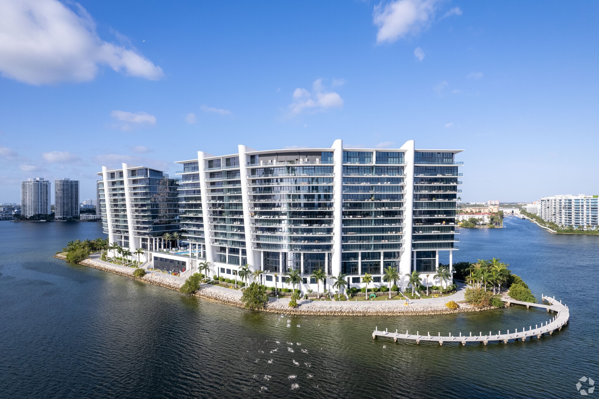 Prive Island Estates, designed by The Sieger Suarez Architectural Partnership, is a modern architectural marvel completed in 2018. This 16-story condominium is located on an exclusive private island in Aventura, offering 160 luxurious units. The building's curved facade and extensive use of glass for balconies and windows create a sleek, contemporary look that complements its waterfront setting. Residents enjoy unparalleled privacy and exclusivity, surrounded by the serene waters of the Intracoastal Waterway.