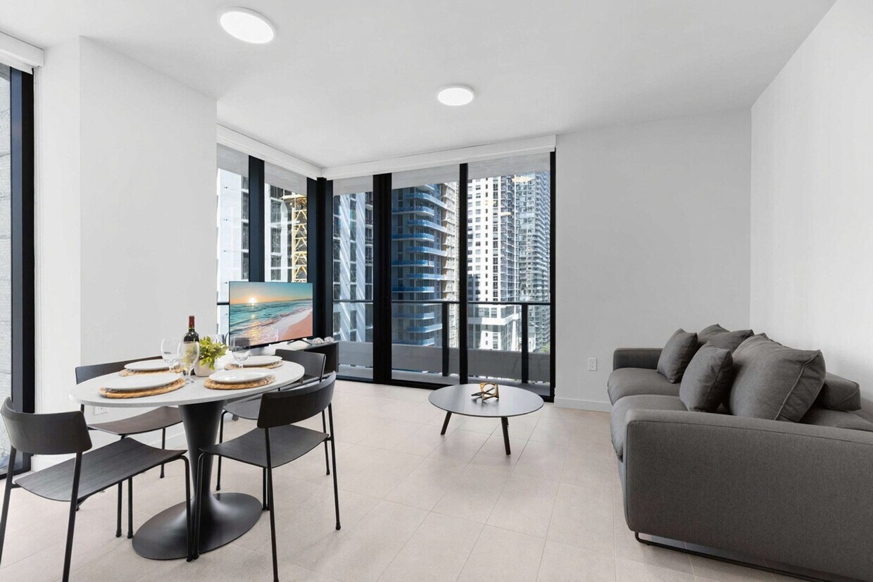 The advertised rate of $3,391/month is the lowest available price, based on a 30 day(s) stay with a move-in date of August 31, 2026. Rates vary depending on the duration of stay, season, and other parameters. For exact pricing and additional pricing components, please visit our website and enter your desired move-in and move-out dates. The rate is applicable when billed upfront; it can be higher if billed in multiple payments. Feel at home in this bright 1-bedroom apartment at 501 Northeast 1st Avenue in Downtown Miami, featuring floor-to-ceiling windows and a private balcony. This curated apartment features designer furnishings, a sleek Italian kitchen with premium appliances, and an in-unit washer and dryer. The kitchen is fully equipped with custom Italian cabinetry and counters, an integrated paneled refrigerator/freezer, a speed oven, a dishwasher, a coffee maker and kettle, cookware and kitchen essentials, silverware, dishes and wine glasses, a dining table for shared meals, and matte black Kohler fixtures. Relax in the open-concept living area with finished flooring and custom window treatments. The bathroom features custom Italian vanities, matte black Kohler plumbing fixtures, and contemporary counters and cabinetry. Valet service is conveniently provided. Self-parking is managed by a third-party company, Metropolis, and requires a separate payment directly with them. Parking rates are $15 for 1 hour, $20 for 2 hours, $30 for 3 hours, $40 for 10 hours, and $50 for 24 hours, and all rates are subject to taxes and additional fees. Located in the heart of Downtown Miami at 501 NE 1st Ave, you're minutes away from culture, nightlife, dining, and waterfront views. Attractions and highlights include Bayside Marketplace, Kaseya Center, Bayfront Park, Brickell City Centre, Wynwood Arts District, Miami Design District, South Beach, and Miami International Airport. Please do not place cardboard in the trash chute. Flatten boxes and take them to the loading dock. Parking enforcement is active 24/7. [SI]