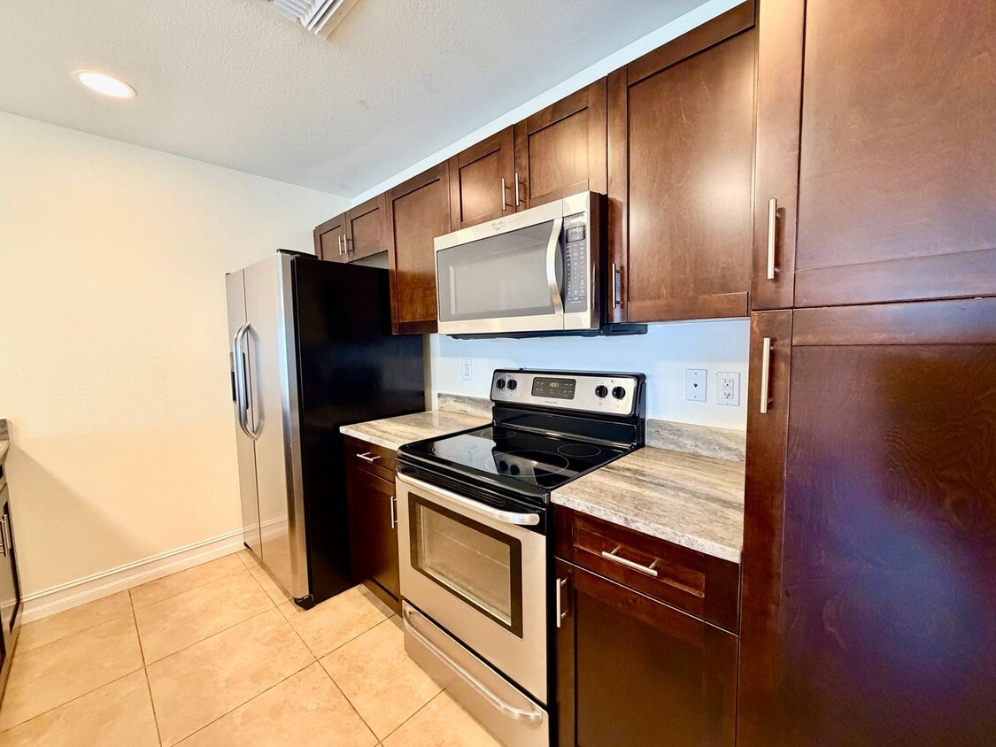 Centrally located 3-bedroom, 2-bathroom duplex with a 1-car garage! This unit features tile flooring throughout, fresh interior paint, and updated bathrooms, creating a clean and modern living space. The layout offers a comfortable living area and a spacious primary bedroom with a large closet. Enjoy the convenience of an inside laundry room with washer and dryer and the added benefit of lawn service included in the rent. Pets are welcome with owner approval and a $400 refundable pet deposit per pet. Conveniently located near shopping, dining, and major roadways, this home offers both comfort and accessibility. Schedule your showing today! Se habla español!