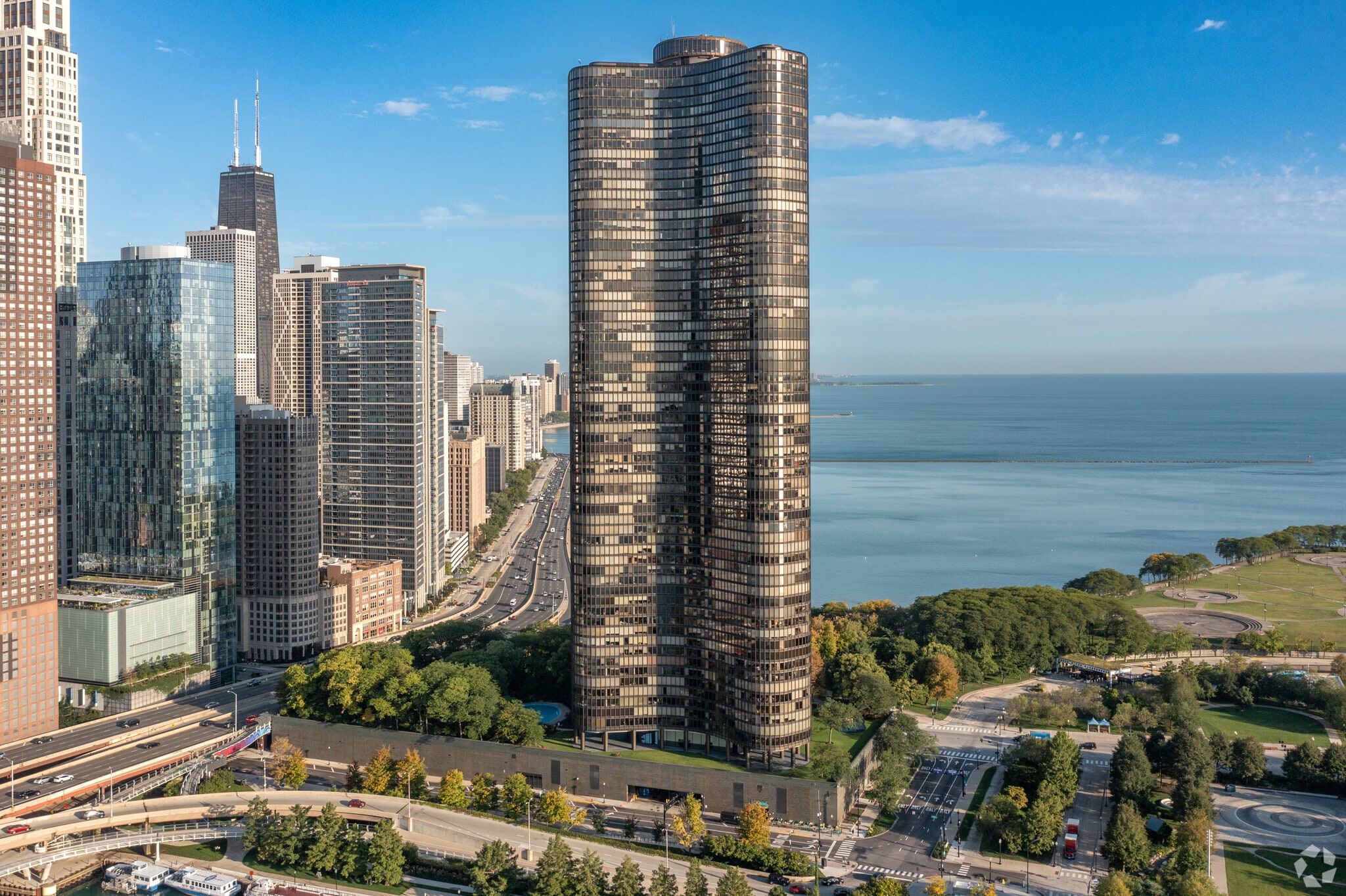 Lake Point Tower, designed by Lake Point Tower Renaissance Plaza, LLC, stands as a prominent fixture in the Streeterville neighborhood of Chicago. Completed in 1968, this 70-story building houses 752 condominium units. Its cylindrical design and reflective glass facade are hallmarks of modern architectural style, offering residents panoramic views of Lake Michigan, the Chicago River, and the city skyline. As the only residential building east of Lake Shore Drive, Lake Point Tower provides a unique vantage point for its residents.