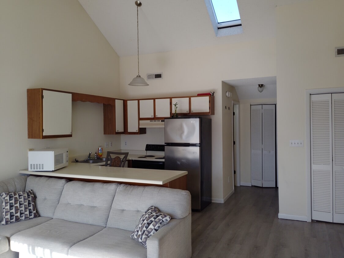 Third-floor large studio apartment in Island Green for long-term rental by one occupant only. Luxury vinyl plant flooring throughout. Cathedral ceiling with skylight, two closets. Full bath, full kitchen, and central A/C. Washer/dryer included. Large private deck with a peaceful view. Furnished with queen bed, couch, dining table with chairs, shelves, and stools. Long-term lease with $950 monthly rent. Rent includes water/sewer, trash removal, and Spectrum cable and internet. The tenant pays for electricity. Available now. No application fee or other fees. NOT a seasonal rental. STRICTLY NON-SMOKING AND NO PETS. Please email me about your monthly income and confirm that you will be the only occupant living in this unit, you don't ever smoke anywhere, have no pets, and have the first month's rent and the security deposit (same as monthly rent) ready to rent this unit immediately.