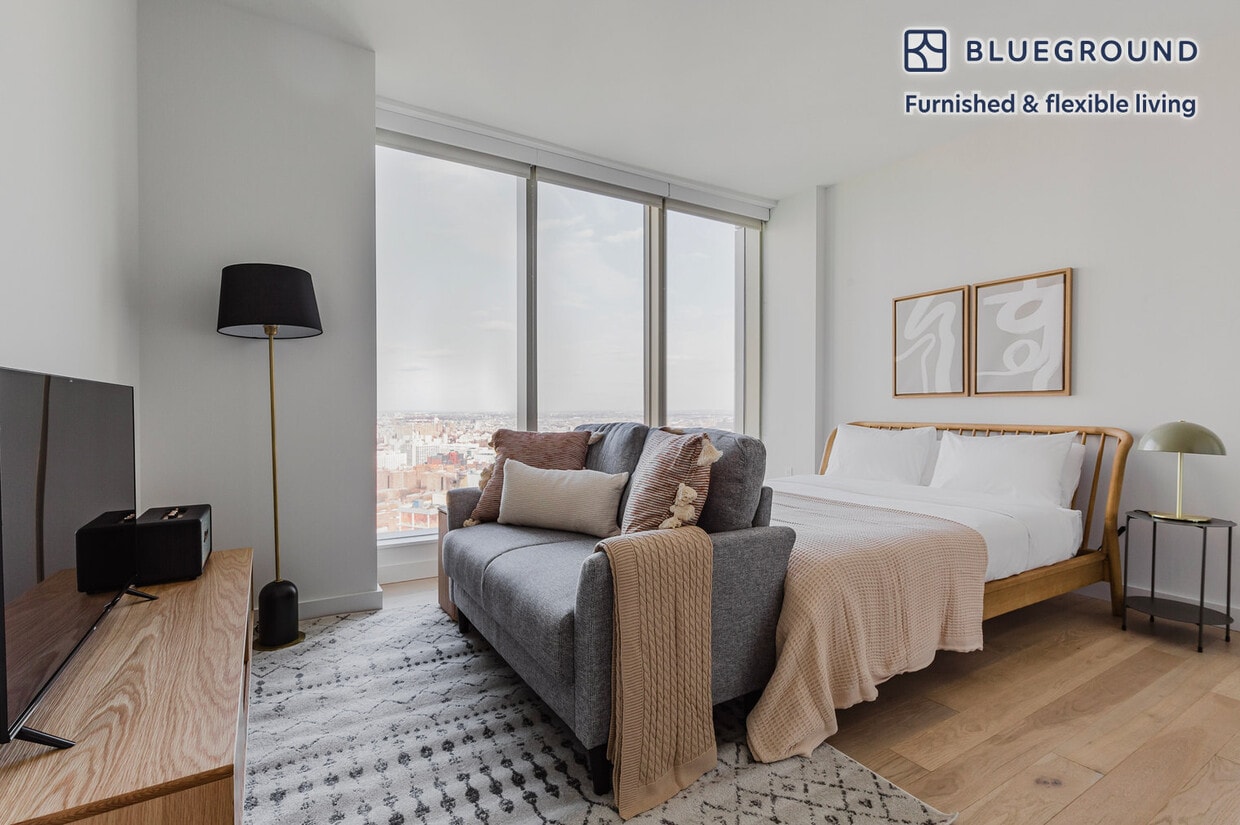 Discover the best of New York, with this studio apartment in Downtown Brooklyn with high floor views over the city. It’ll be easy to simply show up and start living in this furnished apartment with its fully equipped kitchen, living room, and our dedicated, on-the-ground support. (ID #NYC1683) The advertised rate of $4,090/month is the lowest available price, based on a 11 month(s) and 29 day(s) stay with a move-in date of September 16, 2027. Rates vary depending on the duration of stay, season, and other parameters. For exact pricing and additional pricing components, please visit our website and enter your desired move-in and move-out dates. The rate is applicable when billed upfront; it can be higher if billed in multiple payments. Brokers are welcome to reach out. Were you looking for an unfurnished lease? Try Blueground instead and upgrade from unfurnished to furnished living: - Furnished at rates comparable to unfurnished - No setup or furniture costs - save thousands - Move-in ready - save time, just bring your suitcase Designed with you in mind Thoughtfully designed with bespoke finishes, modern furnishings, and a fully equipped kitchen, you’ll enjoy that “I’m home” feeling with this Blueground apartment. Whether you’re lounging in your lovely living room streaming the latest and greatest entertainment on the smart TV or premium wireless speaker, or getting some well-earned rest on the superior quality mattress with fully stocked linens, you’ll fall in love with everything this Downtown Brooklyn apartment has to offer. This apartment also offers in-apartment laundry. Sleeping arrangements Queen Bed, 63in/160cm Amenities Building amenities unique to this studio apartment include an on-site: - BBQ Area - Doorman - Dryer - Elevator - Washing machine - Lounge - Pets allowed Arrival and ongoing support The entire apartment is yours to enjoy! Throughout your stay, you’ll have access to our Client Experience team through the Blueground App. You can schedule additional cleanings, submit maintenance requests, and view our neighborhood recommendations with just a few taps. We’ll share all details upon confirmation of your stay. Ideally Located This furnished apartment is located in Downtown Brooklyn, one of the borough's most sought-after neighborhoods. The bustling area is characterized by both office towers and residential buildings, so there's a wide variety of restaurants serving cuisine from all over the world, night and day. Downtown Brooklyn is also the site of the Brooklyn Academy of Music, a cutting edge arts complex, and it's an easy walk to the foot of the famous Brooklyn Bridge. The neighborhood is served by several subway lines and bus routes, making it easy to get to Manhattan and the city's other boroughs. Other things to note Building amenities may have an extra cost. This Blueground apartment has flexible lease options, allowing you to book it for one month, a year, or more. Pets are welcome, though weight limits and breed restrictions apply and may incur fees. Brokes CYOF. We take great pride in ensuring every photo displayed is shot in our own units with our actual furnishings. That said, we regularly refresh our decor and furniture arrangement, which may differ from what’s pictured. [SI]