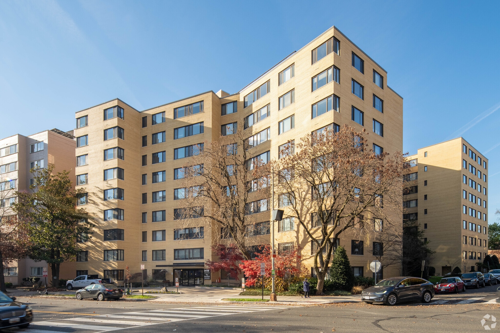 The Garfield, a nine-story condominium building, stands as a testament to mid-century modern design in the heart of Chevy Chase, D.C. Completed in 1957, this building features 166 units and offers a blend of simplicity and functionality. Its location on Connecticut Avenue places it within a vibrant community, surrounded by local businesses and lush greenery. The Garfield's symmetrical facade and evenly spaced windows reflect its straightforward architectural style, making it a distinctive yet unpretentious residence in this suburban neighborhood.