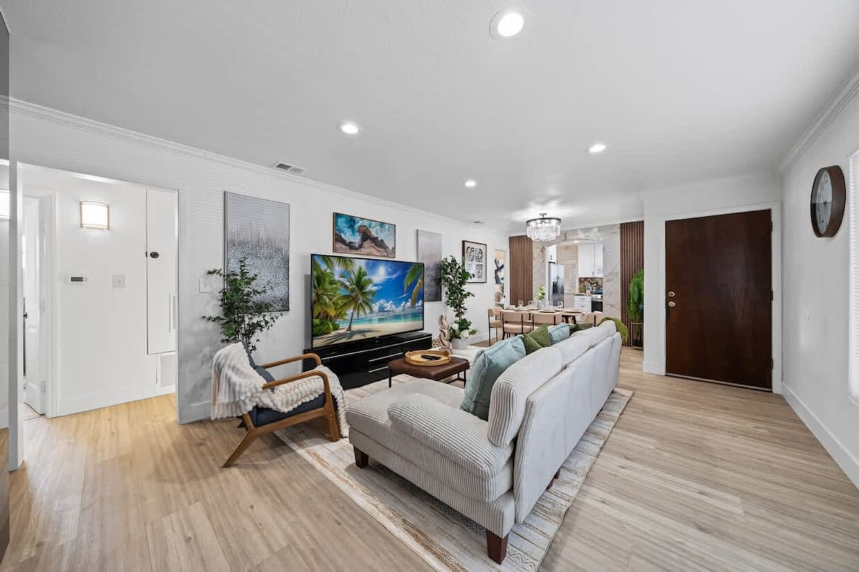 Welcome to this 4-bedroom, 1600 sqft house in El Cajon, where you'll feel at home. All rooms are on the ground floor and feature a walk-in shower. This house features a modern, fully equipped kitchen with a coffee machine and essentials like coffee, cooking oil, sugar, and salt. There are dining tables and chairs both inside and outside for at least 16 people. The air-conditioned living area includes 80" flat-screen smart TVs with cable and Roku for Netflix, YouTube, and Disney+, plus a game console. You'll also find a fully stocked bathroom with a walk-in shower, bathtub, shampoo, body wash, a hairdryer, and fresh towels. In-unit washer, dryer, and detergent are available. Enjoy front yard parking for 6 cars or more. Pets are welcome. Nestled in a peaceful El Cajon neighborhood, this home offers suburban serenity and seamless access to San Diego’s top attractions. Explore the vibrant downtown area with its local shops and cafes, or enjoy nature at Mission Trails Regional Park and El Capitan Reservoir. With easy freeway access, you can quickly reach downtown San Diego, the San Diego Zoo, and the beaches of La Jolla and Coronado. Grocery stores, restaurants, and essential shops are also just a short drive away. Quiet hours are between 9 PM and 8 AM. Excessive noise may lead to neighbor complaints or visits from local authorities, and a $1,000 violation fee may apply. Each unauthorized guest or pet may incur a $100 per person/pet per day/night fee. Smoking is allowed outside of the home only with windows and doors closed. Tampering or disconnecting security camera, noise monitor or other security devices will result in $1000 fine. A minimum fee of $100 may be applied to key-related issues such as forgetting to return keys after checkout, lost keys, locking yourself out and requiring us to travel to bring spare keys, or key replacements, etc. Includes reliable 500 Mbps Wi-Fi. [SI]
