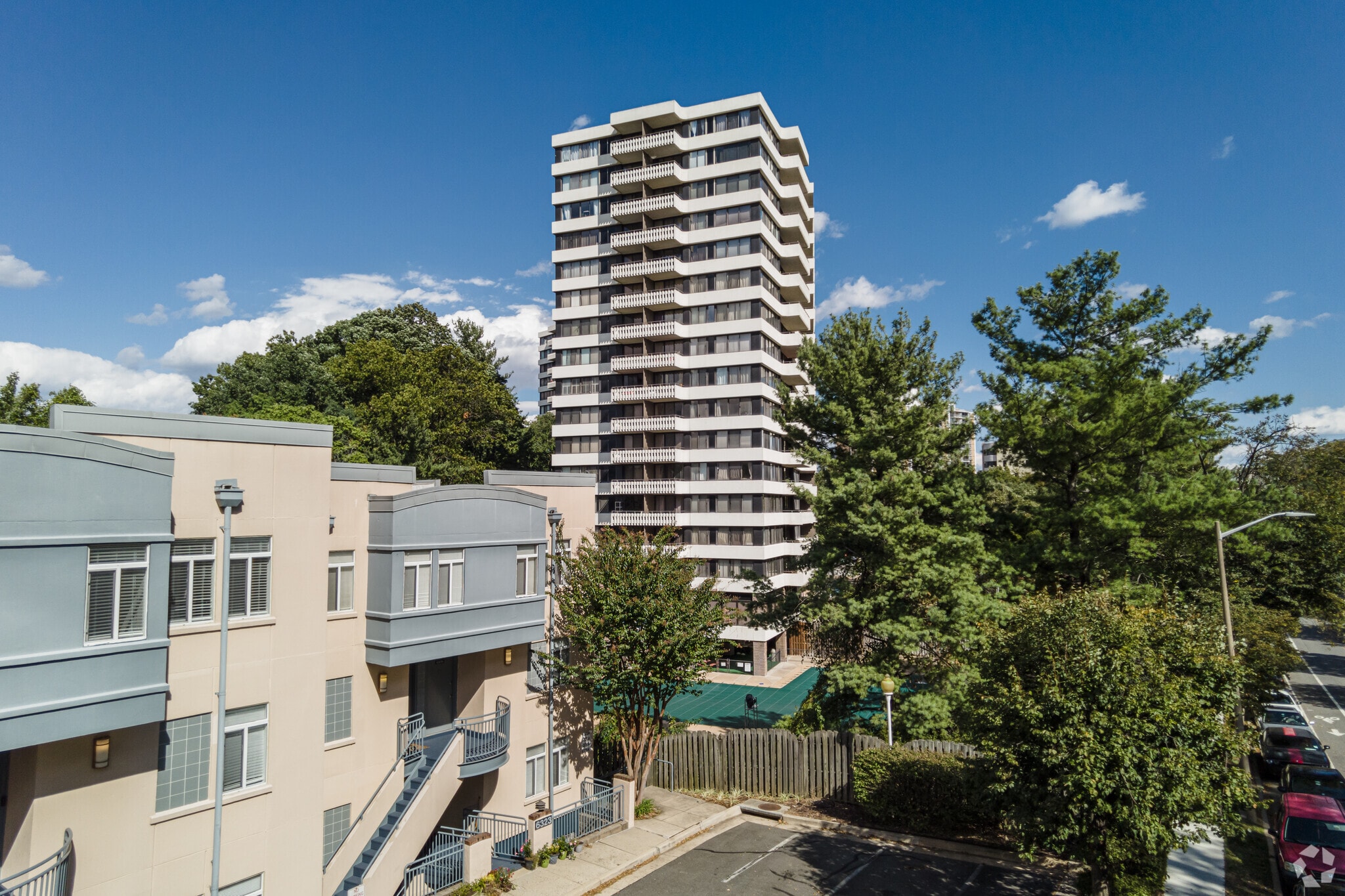The Olympus, a 16-story condominium tower completed in 1974, stands as a prominent fixture in Alexandria's Landmark neighborhood. With 255 units, this high-rise offers residents a blend of urban convenience and suburban tranquility. The building's curved facade and horizontal balcony lines create a distinctive silhouette against the Alexandria skyline. As the West End continues to transform, The Olympus remains a steadfast presence, providing a range of living options for those seeking a central location with easy access to the greater Washington D.C. area.