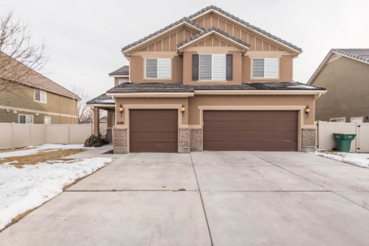 DESCRIPTION: Beautifully updated 5-bedroom, 2.5-bathroom single-family home with a 3-car garage Located in the desirable Spring Creek Ranch subdivision Conveniently situated just off Pioneer Crossing Minutes from I-15 and The Meadows Shopping Center Two-story layout with excellent curb appeal and a spacious, functional design FEATURES: Formal dining room and eat-in kitchen with direct access to the backyard Kitchen includes white cabinetry, custom backsplash, stainless steel appliances, modern pendant lighting, and wood laminate flooring Upstairs bedrooms feature custom paint for added character Spacious primary suite with abundant natural light and walk-in closet Large ensuite bathroom with extra cabinetry and generous counter space Fully fenced backyard with patio space ideal for grilling and entertaining HOA amenities include a community park with pavilions, tennis courts, basketball courts, and walking trails UTILITIES: Tenant responsible for all utilities Tenant responsible for yard maintenance $40 monthly HOA fee required No smoking permitted.