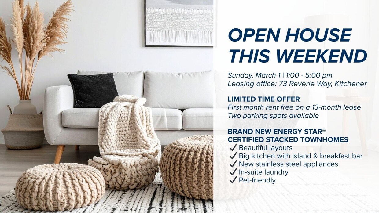 SPRING SAVINGS — FIRST MONTH RENT FREE ON A 13-MONTH LEASE! * TWO PARKING SPOTS AVAILABLE * FLEXIBLE MOVE-IN DATES FEATURES: * Brand new units! * ENERGY STAR® Certified * Stainless steel appliances * Spacious kitchen with quartz countertop and subway tile backsplash * Large kitchen island with breakfast bar * Luxury hard surface flooring * Central air conditioning and heat * Master ensuite with glass shower & walk-in closet * In-suite laundry * Private balcony * Pet-friendly * Nearby parks and trails surrounded by beautiful greenery LOCATION PERKS: Minutes from Sunrise Shopping Centre! Enjoy quick access to Highways 7/8 for easy commuting across Waterloo Region! ADDITIONAL INFORMATION: * Tenants pay utilities (heat, hydro, and water) * Proof of tenant insurance required