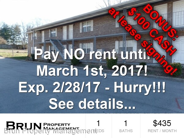 (865) 686-5312 - No rent until 3/1/17 plus $100 CASH bonus - Exp - 2-28-17 - $100 CASH bonus at lease signing! - Expires 2-28-17 - Hurry! These are our February 2017 move in incentives for this unit. Our incentives are based upon your FICO score: >>> No FICO score at all: The $100 CASH bonus at lease signing. >>> 500 to 649 FICO: Pay no rent until 3/1/17. Plus the $100 CASH bonus at lease signing. >>> 650 to 799 FICO: Pay no rent until 3/1/17 + 1/2 off 1st month of renewal. Plus the $100 CASH bonus at lease signing. >>> 800 to 900 FICO: Pay no rent until 3/1/17 + 1st month of renewal free. Plus the $100 CASH bonus at lease signing. Please calls us or visit our website for all qualifications, terms and conditions. www.brunpm.com. (RLNE1835821) Other Amenities - Other- new paint, water & sewer included, one assigned parking space, blinds, finished wood trim, large one bedroom, first floor unit, stove & refrigerator included, no vouchers, wood look vinly plank flooring in most of unit, 1 vehicle maximum, guest parking on premises, utilities provided by kub, schools: inskip elementary - gresham middle - central high. Appliances - Dishwasher, Air Conditioning. Details regarding this property's Utilities - Resident Pays Electricity. Pet policies - Small Dogs Allowed, Cats Allowed.
