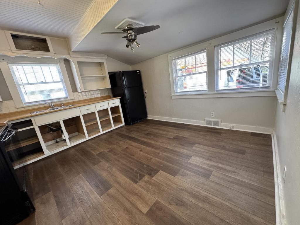 A two bedroom one bath downstairs apartment with living room, dining room, and spacious kitchen with large windows all around for lots of natural light; hardwood floors; Laundry room washer and dryer hookup; A detached garage that could be used as a workshop; Huge lot with access to the back alley. Will be installing cabinet doors.