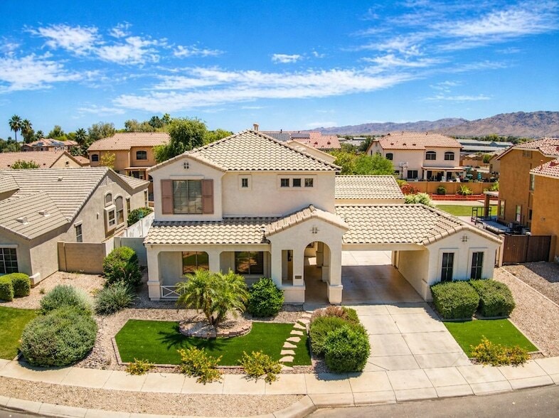 Beautiful move-in ready 4-bedroom, 2.5-bath two-story rental home with a resort-style backyard, sparkling private pool, lush grass, and mountain views. This home features high ceilings and tile flooring throughout the main living areas, offering both style and easy maintenance.Enjoy an open-concept layout with a spacious kitchen, dining, and family roomperfect for entertaining. The large eat-in kitchen includes abundant cabinetry, a large island with breakfast bar, double wall ovens, black appliances, a walk-in pantry, and a buffet counter. A powder room and laundry are conveniently located downstairs. Upstairs, a versatile loft provides additional living space. The primary suite features a private balcony entrance, walk-in closet, and a full bath with double vanity, separate tub, and shower. Secondary bedrooms are generously sized with ceiling fans.Step outside to your private oasis with a covered patio, sparkling pool, and grassy areaideal for relaxing or hosting guests. Conveniently located near schools, shopping, and easy access to the Loop 202 for a smooth commute.