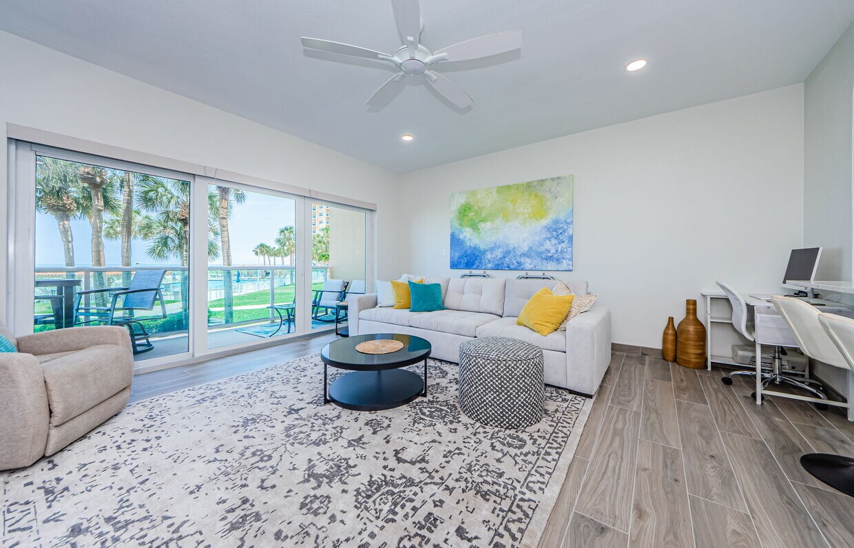 Experience oceanfront luxury with this stunning condo. Positioned poolside, it offers unrivaled proximity to the waterfront, beach, and essential amenities. Renovated in 2023, it features vaulted ceilings, stone countertops, and premium fixtures. Ideal for long-term stays, enjoy resort-style amenities: 24-hour front desk, security, gym, game room, library, and heated pool, plus BBQ facilities and gated parking. Located on North Beach, a mile from downtown Clearwater Beach, enjoy tranquility with access to shops via complimentary trolley or bicycles. Fully furnished with a queen bed, two TVs, WiFi, safe, soaking tub/shower, and full kitchen. Bi-weekly cleaning, utilities, HOA fees, insurance, and landline included. Rental minimum is three months with seasonal pricing: peak season $5,000/month, summer $4,500/month, both with $2,500 refundable deposit. Pets not allowed in unit, smaller pets permitted in building. Enjoy sunset views and serenity in this superior Clearwater Beach condo.