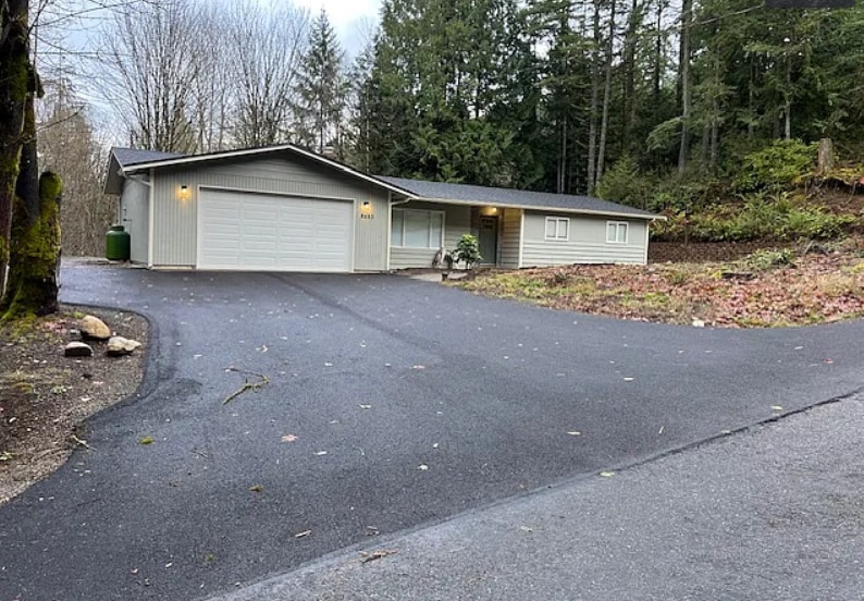 Ranch style house with two car garage, big yard, surrounded by green belts, landscaping and private woods, large back deck with French Doors off the master bedroom. One level home with 3 bedrooms and two bathrooms, one off master and a second bathroom off kitchen with a laundry room. Large living room with open concept has gas propane fired stove plus home has new HVAC with AC & heat, comfortable dining room with large kitchen and view into nature out the back. Location is only minutes to highway 16 off Mullenix, ten minutes to the Southworth ferry via Seattle for commuting. The garage offers dry parking, room for additional vehicles, boat or RV with an additional small shop area for your yard and maintenance items. Also a large BBQ family gathering area out back and an additional storage shed.
