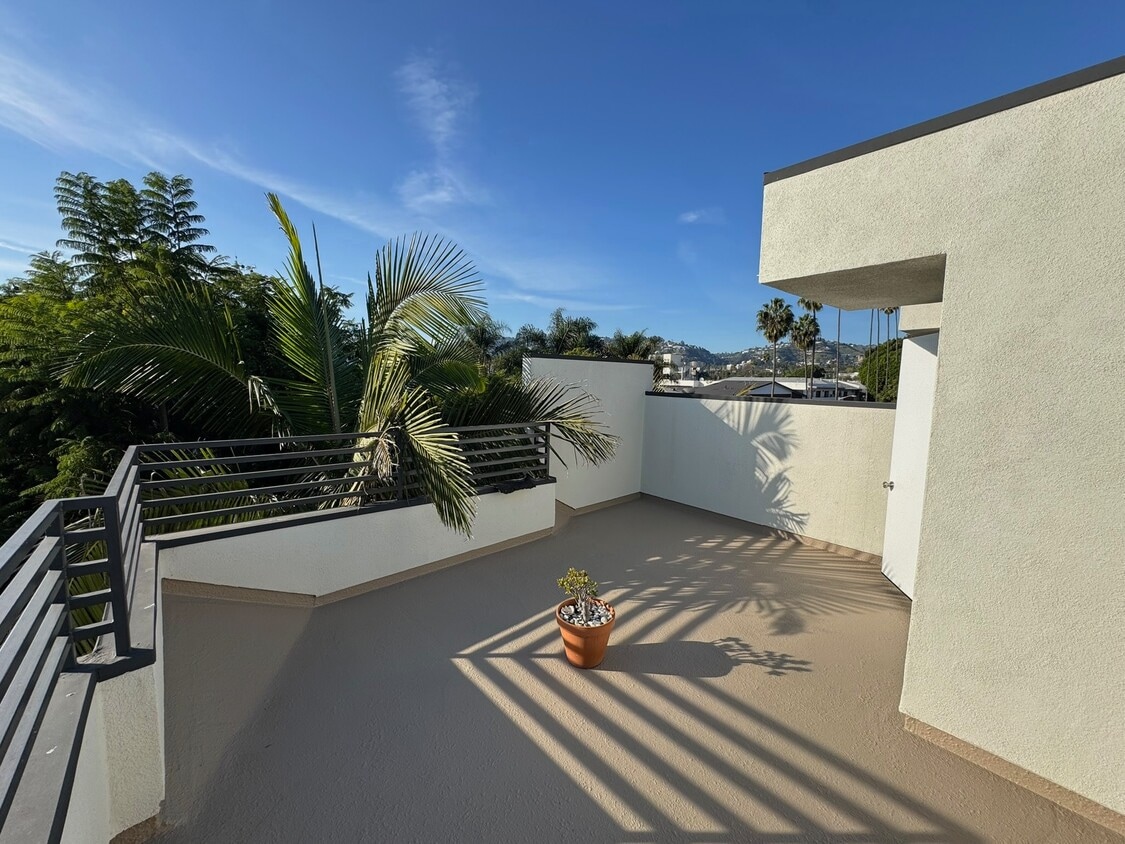Light-Filled West Hollywood Townhouse w/ Roof Deck Views + Outdoor Space Welcome to this beautifully renovated corner-unit townhouse located on a quiet residential block in one of West Hollywood's most desirable neighborhoods. Set within a boutique 4-unit building, this home offers the perfect blend of privacy, space, and walkable city living. Home Highlights Over 1,500 sq ft of spacious, light-filled living South & west-facing corner unit with abundant natural light Fully renovated in 2021 (building constructed in 2000) Soaring 16-foot ceilings in upstairs hallway and primary bedroom Each bedroom features its own ensuite bathroom Custom closet built-ins throughout for maximum storage 2 private balconies + kitchen patio + rooftop deck Rooftop deck with views of Downtown LA, Century City & Hollywood Hills Two side-by-side garage parking spaces Additional private storage unit included Thoughtful Layout & Indoor-Outdoor Living The open and airy main level flows seamlessly from the kitchen to a private patio, ideal for morning coffee or al fresco dining, and warm-weather entertaining. Upstairs, both bedrooms are generously sized with ensuite baths, creating ideal separation for sharing or guests. The rooftop deck is a true standout perfect for entertaining, sunset views, or simply enjoying LA's skyline. Boutique Building & Community Feel This intimate 4-unit building offers a rare sense of community with friendly neighbors and a quiet, residential atmosphere a peaceful retreat while still being in the heart of West Hollywood. Prime West Hollywood Location Walkable to Melrose & Fairfax Minutes to Whole Foods, Trader Joe's, gyms, cafes, and boutiques Close to Plummer Park & Poinsettia Park Easy access to Sunset Blvd, The Grove, Beverly Center, and Hollywood This is a rare opportunity to rent a townhouse-style home with multiple outdoor spaces, parking, storage, and views in one of LA's most sought-after neighborhoods. Available for move-in now. Don't miss this unique West Hollywood rental.
