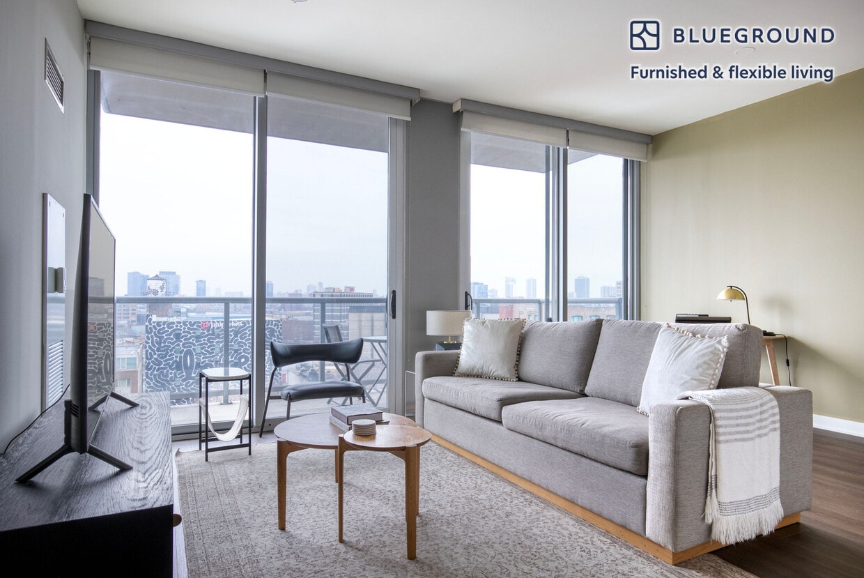 Show up and start living from day one in Chicago with this pretty one bedroom Blueground apartment. You’ll love coming home to this thoughtfully furnished, beautifully designed, and fully equipped River West home with stunning balcony views over the city. (ID #CHI1023) The advertised rate of $1,900/month is the lowest available price, based on a 2 month(s) and 2 day(s) stay with a move-in date of January 11, 2027. If you’re looking for a 1-year stay, the rate is $2,800/month. Rates vary depending on the duration of stay, season, and other parameters. For exact pricing and additional pricing components, please visit our website and enter your desired move-in and move-out dates. The rate is applicable when billed upfront; it can be higher if billed in multiple payments. Brokers are welcome to reach out. Were you looking for an unfurnished lease? Try Blueground instead and upgrade from unfurnished to furnished living: - Furnished at rates comparable to unfurnished - No setup or furniture costs - save thousands - Move-in ready - save time, just bring your suitcase Designed with you in mind Gorgeous furniture, fully equipped kitchen, smart TV, and a premium wireless speaker are just a few of the amenities you’ll find inside this one bedroom apartment. Ideally located in Chicago, you’ll find a lot to love outside as well. When you’re ready to relax, you’ll be happy to discover every Blueground bedroom comes with superior quality mattresses, fully stocked linens, and cozy towels. We handle everything so you can simply show up and start living. This apartment also offers in-apartment laundry. Sleeping arrangements King Bed, 70.8in/180cm Amenities Building amenities unique to this one bedroom apartment include an on-site: - Doorman - Dryer - Elevator - Washing machine - Parking - Pets allowed Arrival and ongoing support The entire apartment is yours to enjoy! Throughout your stay, you’ll have access to our Client Experience team through the Blueground App. You can schedule additional cleanings, submit maintenance requests, and view our neighborhood recommendations with just a few taps. We’ll share all details upon confirmation of your stay. Ideally Located This furnished rental is located in River West. The neighborhood surrounds the Union Pacific railroad tracks and has been recently redeveloped now includes some of the most popular restaurants and residences in Chicago. The area is only a 5 to 10 minute walk from River North and the Loop and has become a hotspot for business travelers and young professionals. Being a flat area, River West is the ideal place for a bike ride or running around on foot. Other things to note This Blueground apartment has flexible lease options, allowing you to book it for one month, a year, or more. Pets are welcome, though weight limits and breed restrictions apply and may incur fees. Parking is offered based on availability and is subject to a fee. We take great pride in ensuring every photo displayed is shot in our own units with our actual furnishings. That said, we regularly refresh our decor and furniture arrangement, which may differ from what’s pictured. Also note - This apartment is located near a railway, so expect to hear moderate noise when trains pass - This apartment includes access to a private terrace - This is a guarded building equipped with a doorman/concierge at all times [SI]