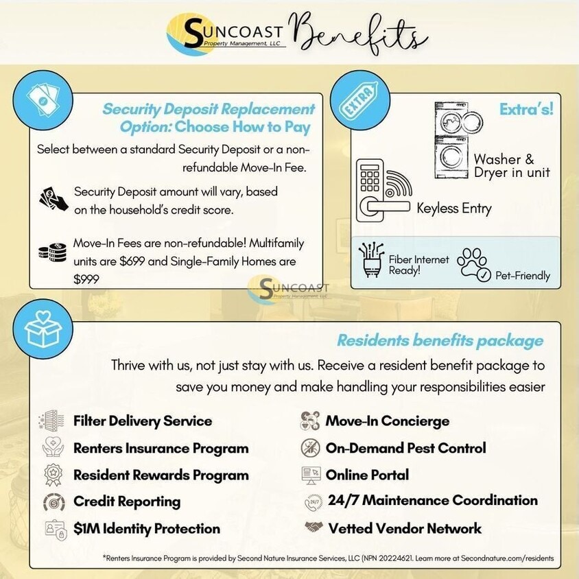 Brand-New 2BR/2BA Apartment in Jacksonville Now Offering In-Unit Washer & Dryer! Discover modern living at its finest in our brand-new quad units, ideally located at the corner of Hood and Sunbeam Road in Jacksonville, FL! These newly constructed downstairs units offer 1,040 sq. ft. of thoughtfully designed space, perfect for comfort, convenience, and style. Apartment Features: Spacious Open-Concept Layout for seamless living & entertaining Upgraded Kitchen with sleek white cabinetry & granite countertops Brand-New Stainless Steel Appliances Two Large Bedrooms & Two Full Bathrooms for ultimate privacy Now Featuring In-Unit Washer & Dryer! Pet-Friendly Community We welcome your furry friends! Prime Location in Jacksonville Conveniently situated near major roadways, shopping, dining, and top-rated schools Easy access to I-295, St. Johns Town Center, and Downtown Jacksonville Close to parks and outdoor recreation Act Fast These Units Wont Last! Move-In Ready Apply online today! Limited Availability Secure Your New Home Now! Take Advantage of Our Exclusive Move-In Special Schedule a tour today and experience modern, maintenance-free living in Jacksonville! Setel Internet Only: ** - The property is exclusively wired for Setel internet. Fiber optic cables are already pre-wired, ensuring high-speed internet service is ready to be set up upon move-in. This provides reliable connectivity for all your online needs, whether working from home, streaming, or browsing. Suncoast's Choose How to Pay Program = More Flexibility. High upfront costs shouldnt hold you back from finding the right home. Thats why we offer two simple options: 1. Pay the traditional full security deposit at move-in, or 2. Choose our Flexible Security Deposit Plan, which lets you spread out your payments while still keeping the same coverage. This program helps ease move-in costs without sacrificing peace of mind. Photos are for illustration purposes only and some details may differ! All SunCoast Property Management residents are enrolled in the Resident Benefits Package (RBP) for $75.00/month which includes liability insurance, credit building to help boost the residents credit score with timely rent payments, up to $1M Identity Theft Protection, HVAC air filter delivery (for applicable properties), move-in concierge service making utility connection and home service setup a breeze during your move-in, on-demand pest control, and much more! The RBP is an additional cost and is not included in the advertised monthly rental rate. More details upon application. BEWARE of potential fraud. If you suspect one of our properties being listed fraudulently, please email: Suncoast Property Management does NOT ask any of our potential residents to wire funds. Our main office is located in Jacksonville; Florida and you can visit our website to verify any rental listing. Lease Administrative Fee. Upon execution of this Lease, Tenant will pay Landlord a nonrefundable Lease Administrative Fee of $200.00. Pay Online Pets Allowed Washer/Dryer Connections Washer/Dryer In Unit ?? Now Leasing: Brand-New 2BR/2BA Apartments on Hood & Sunbeam Months Off Rent + Select Units Free to Apply! Limited Availability – Tour & Apply Today! Welcome to Jacksonville’s newest modern apartment community, located at the highly accessible corner of Hood Road and Sunbeam Road. These brand-new 2-bedroom, 2-bathroom quad units offer the perfect combination of style, comfort, and convenience — all in a prime Southside Jacksonville location near shopping, dining, and major employers. ? Apartment Features: ?? Washer & Dryer Included in Every Unit ??? Granite Countertops & Sleek White Cabinetry ?? Luxury Vinyl Plank Flooring Throughout ?? Open-Concept Floor Plan – 1,040 Sq. Ft. of Living Space ?? Bright Interiors & Modern Finishes ??? Spacious 2-Bedroom, 2-Bathroom Layout ?? Prime Jacksonville Location – Near: I-295, Philips Hwy & Baymeadows Rd Shopping centers, grocery stores & restaurants Top schools, healthcare facilities & fitness centers Easy commutes to Downtown, St. Johns Town Center, and major employers ?? Pet-Friendly Living Your pets are welcome! We offer a pet-friendly community with no pet rent and a non-refundable pet fee. Enjoy a home that’s perfect for your entire household – furry friends included! ?? Contact Us Today to Schedule Your Tour! These brand-new homes are in high demand and won’t last long. Suncoast's Choose How to Pay Program = More Flexibility. High upfront costs shouldnt hold you back from finding the right home. Thats why we offer two simple options: 1. Pay the traditional full security deposit at move-in, or 2. Choose our Flexible Security Deposit Plan, which lets you spread out your payments while still keeping the same coverage. This program helps ease move-in costs without sacrificing peace of mind. Photos are for illustration purposes only and some details may differ! All SunCoast Property Management residents are enrolled in the Resident Benefits Package (RBP) for $75.00/month which includes liability insurance, credit building to help boost the residents credit score with timely rent payments, up to $1M Identity Theft Protection, HVAC air filter delivery (for applicable properties), move-in concierge service making utility connection and home service setup a breeze during your move-in, on-demand pest control, and much more! The RBP is an additional cost and is not included in the advertised monthly rental rate. More details upon application. BEWARE of potential fraud. If you suspect one of our properties being listed fraudulently, please email: Suncoast Property Management does NOT ask any of our potential residents to wire funds. Our main office is located in Jacksonville; Florida and you can visit our website to verify any rental listing. Lease Administrative Fee. Upon execution of this Lease, Tenant will pay Landlord a nonrefundable Lease Administrative Fee of $200.00.