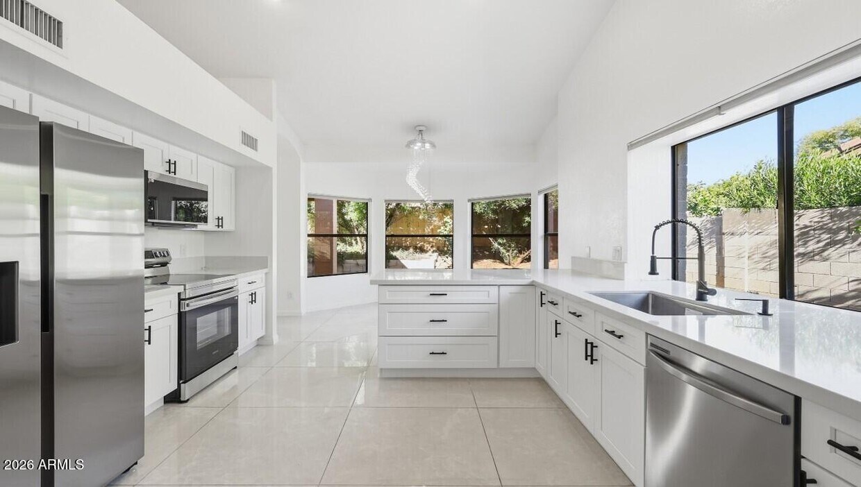 Scottsdale Rental Beautifully Updated Single Level 3 Bed/2 Bath/2-Car Garage In Desirable Sweetwater Ranch. Enter to spacious great room with soaring ceilings. Corner lot for added privacy. Brand-new stainless-steel appliances,breakfast bar,sleek quartz countertops and plenty of windows make this kitchen the true heart of the home. Large format polished tile flooring enhances the home throughout. Secondary bedrooms feature wood-like laminate. Enjoy a spacious master bedroom with access to backyard,ample closet space,all new en-suite bath with walk-in shower and separate soaking tub,quartz double vanity,and soft close cabinetry. Mature Trees and desertscape. Convenient access to shopping,dining,parks,golf,trails,medical,schools and freeway access. Great location!