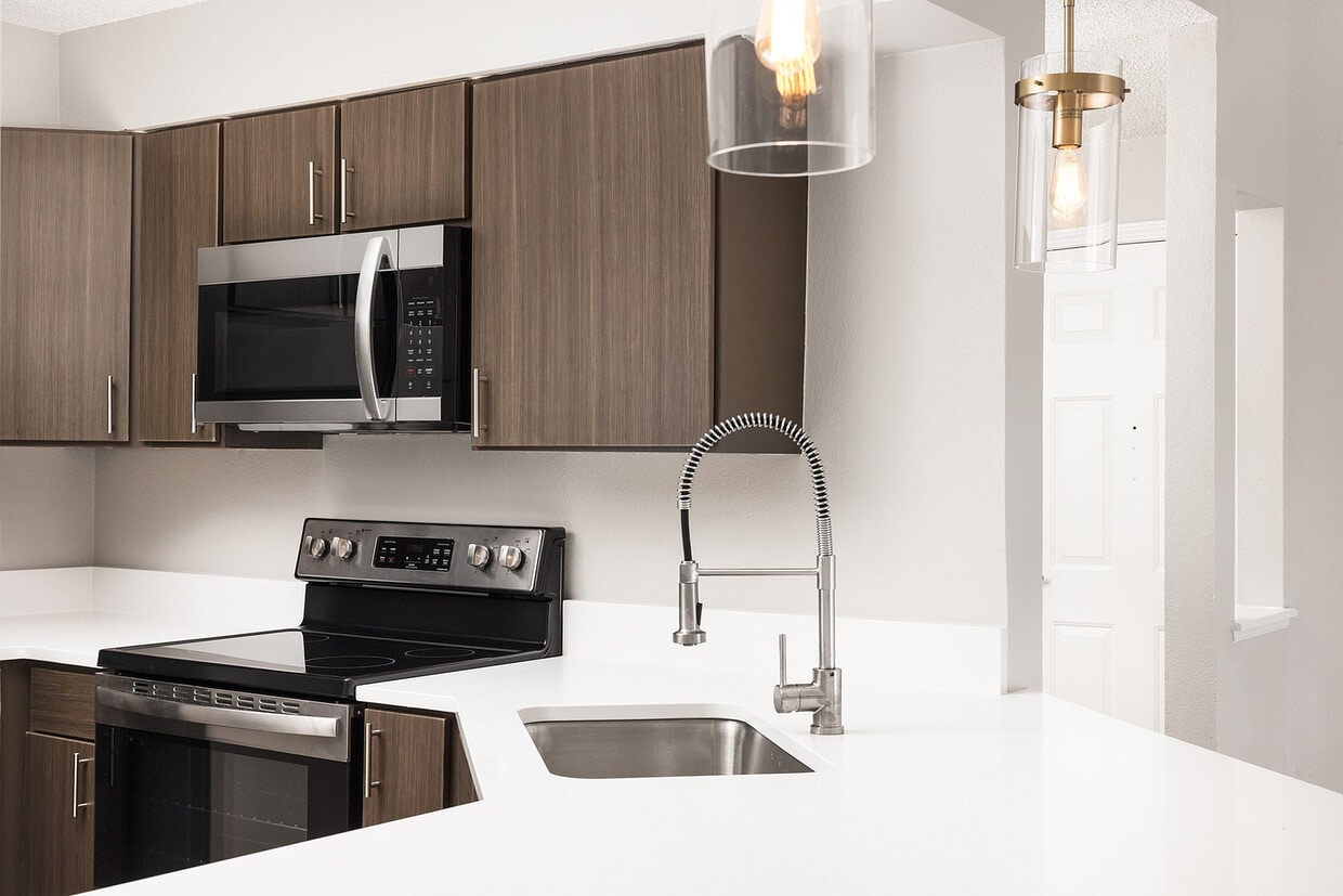 Modern apartment kitchen with elegant white countertops, stainless steel appliances, and warm wood flooring.