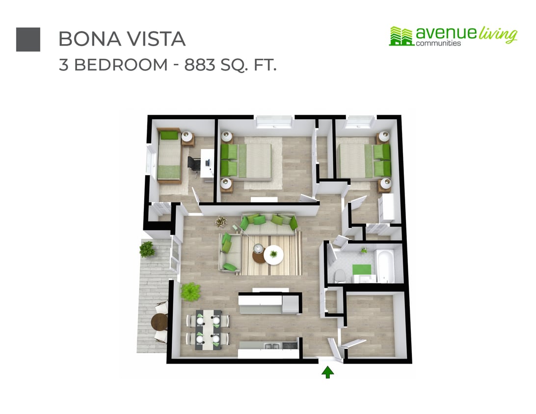 Bona Vista has one to three-bedrooms with rent ranges from $1,060/mo. to $1,655/mo.