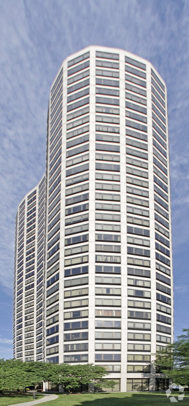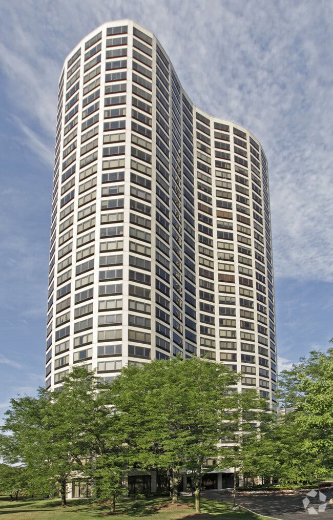 5000 Town Center stands as a prominent fixture in Southfield's skyline. Completed in 1982 and designed by Solomon Cordwell Buenz & Associates Inc., this 33-story condominium tower offers 215 units with sweeping views of the surrounding area. The building's curved facade and repetitive pattern of windows and balconies create a distinctive silhouette against the Michigan sky. Situated on over 5 acres of meticulously landscaped grounds, 5000 Town Center provides residents with a blend of urban convenience and suburban tranquility.