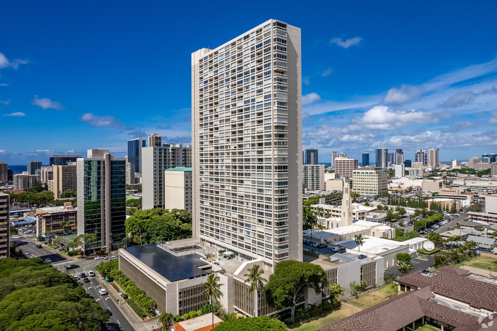 Banyan Tree Plaza, a 36-story condominium building, stands prominently in the Makiki neighborhood of Honolulu. Completed in 1974, this high-rise features 242 units and offers a blend of urban convenience and serene living. The building's simple, modern design is characterized by a grid-like pattern of balconies and windows, providing residents with ample natural light and stunning views of the city, mountains, and ocean.