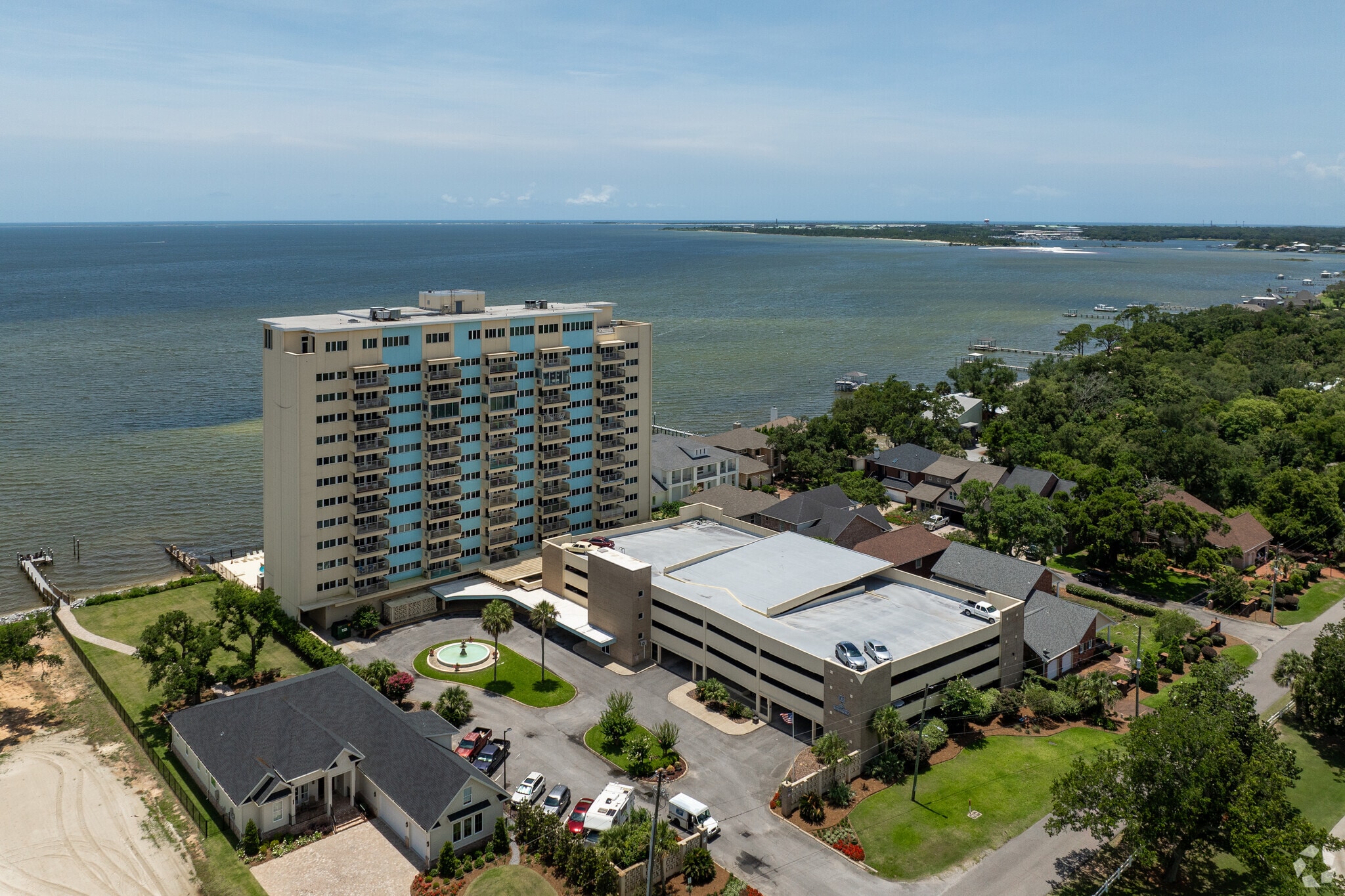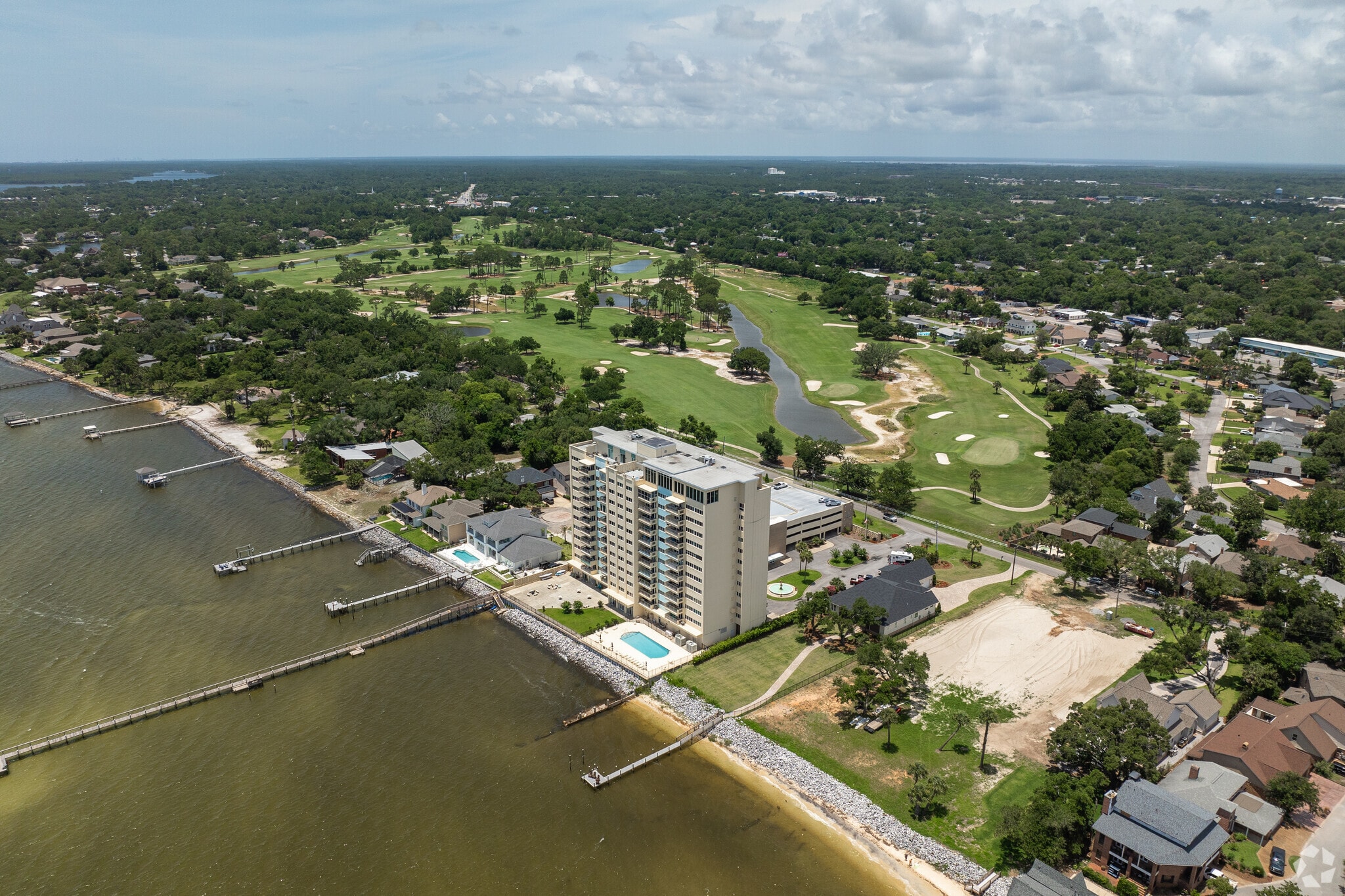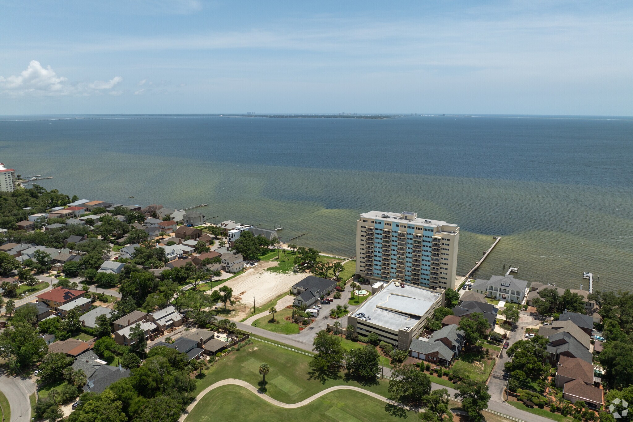 Bayshore Condominiums, a 13-story residential tower completed in 1964, stands as a prominent fixture along Pensacola Bay. Located in the Warrington neighborhood, this 98-unit complex offers residents a blend of coastal living and urban convenience. The building's position provides sweeping views of the bay, the Pensacola Country Club golf course, and the surrounding area, making it a sought-after address for those seeking a waterfront lifestyle.