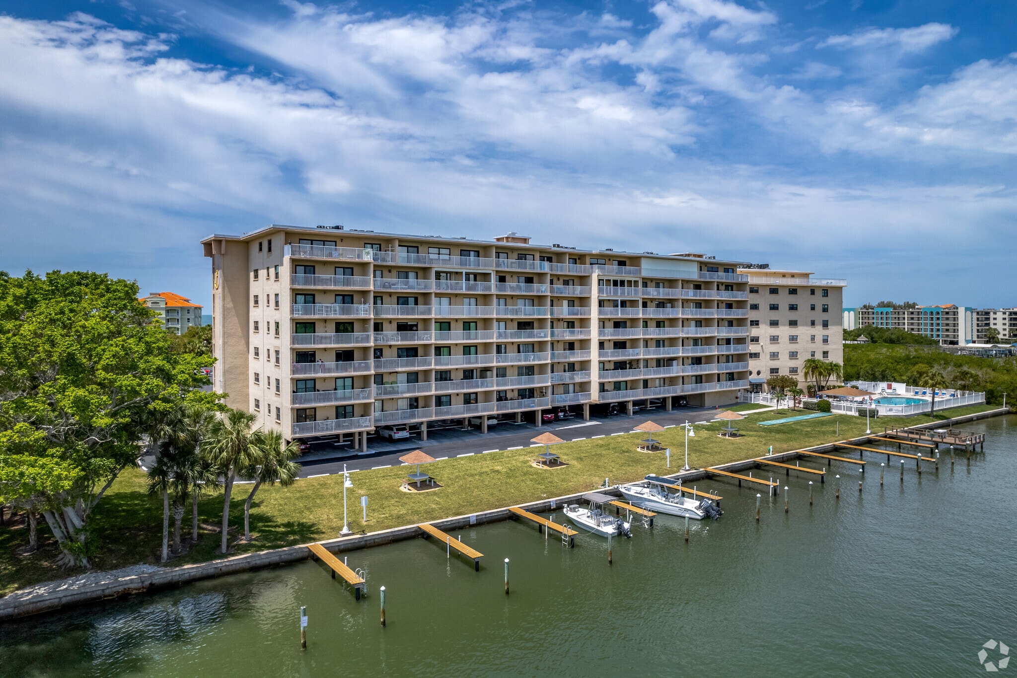 Bayshore Yacht and Tennis Club, completed in 1976, stands as a prominent fixture in the coastal community of Indian Shores, Florida. This 8-story condominium complex houses 112 units, offering residents a prime location between the Gulf of Mexico and the Intracoastal Waterway. The building's straightforward design prioritizes functionality and maximizes the stunning water views that have made this area a sought-after destination for both permanent residents and seasonal visitors. With its array of amenities and proximity to the beach, Bayshore Yacht and Tennis Club embodies the relaxed, yet active lifestyle characteristic of Florida's Gulf Coast.