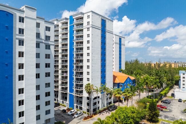 Blue Lagoon, completed in 2003, stands as an 18-story condominium complex in the Flagami neighborhood of Miami. With 608 units, this waterfront property offers residents a blend of urban convenience and tropical tranquility. The building's simple, functional design features a combination of white and blue exterior walls, with balconies adorning each floor. Situated on the edge of its namesake lagoon, Blue Lagoon provides easy access to Miami's vibrant city life while offering a serene escape from the urban hustle.
