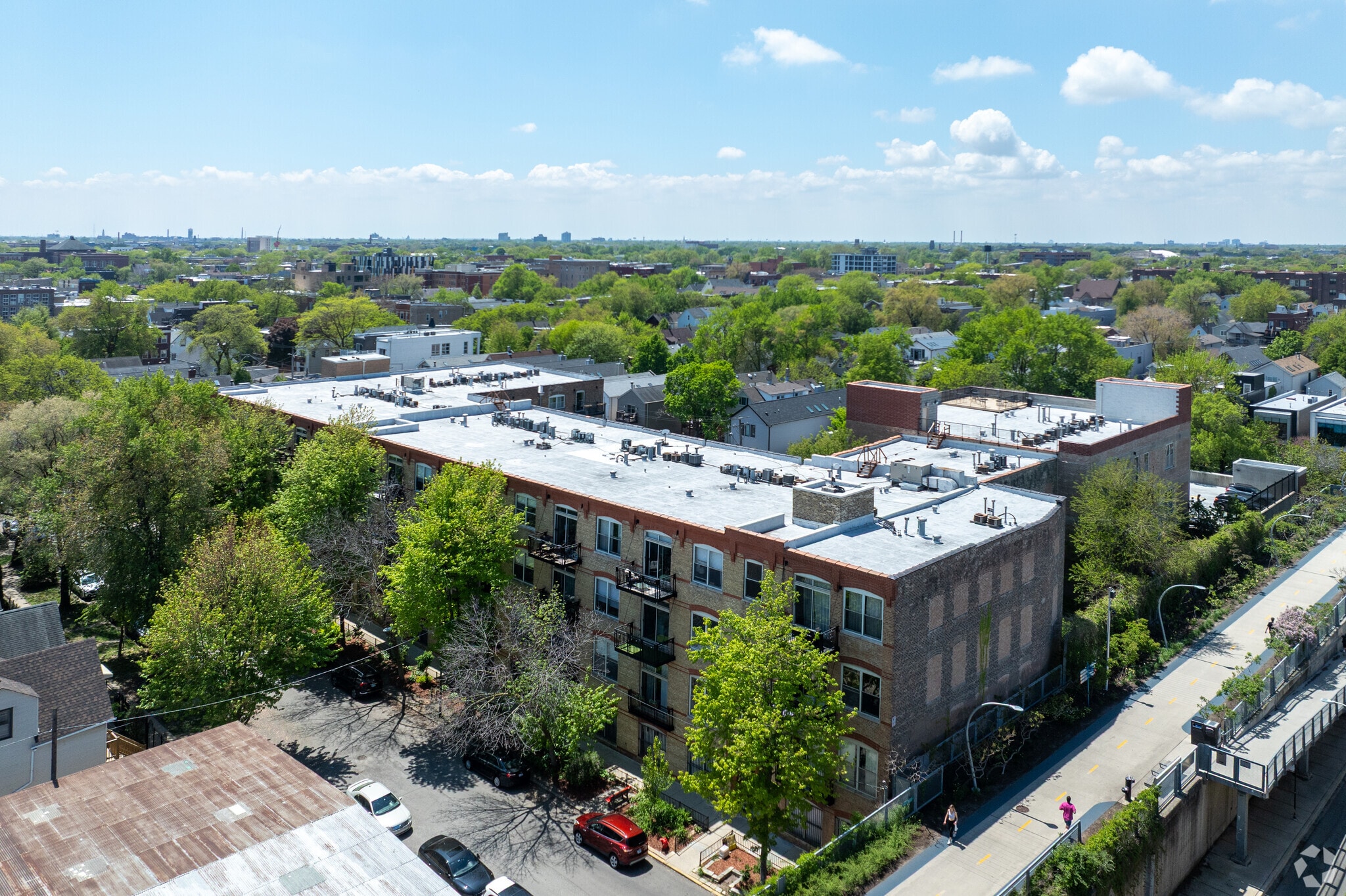 Buck City Lofts, completed in 2002, stands as a testament to modern urban living in Chicago's vibrant Bucktown neighborhood. This 4-story condominium building houses 90 units, offering residents a blend of industrial charm and contemporary comfort. Situated adjacent to the popular 606 Trail, the building provides easy access to one of the city's most beloved recreational spaces. The lofts feature exposed brick walls, soaring timber ceilings, and large windows that flood the spaces with natural light, creating an authentic loft experience that pays homage to the area's industrial past while catering to today's urban dwellers.
