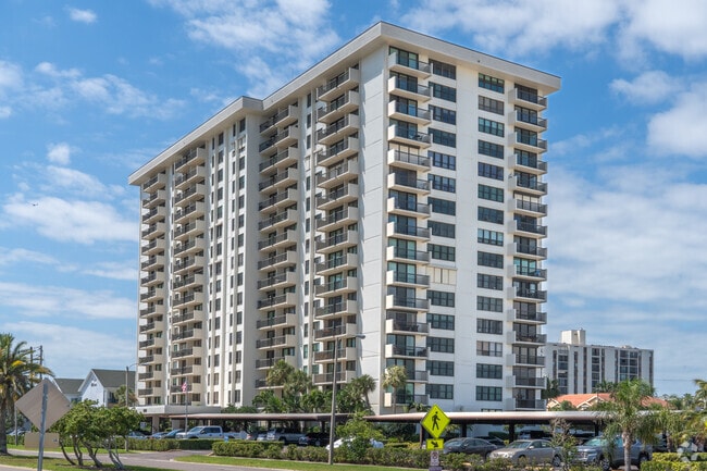 Clipper Cove is a 17-story condominium building completed in 1978, located in the serene and prestigious Island Estates neighborhood. With 185 units, this building offers a blend of modern design and practical living spaces. Each floor features balconies, providing residents with stunning views of the surrounding Clearwater Bay and the Gulf of Mexico. The building's straightforward, modern design is complemented by a covered parking area at the ground level, ensuring convenience and accessibility for all residents.