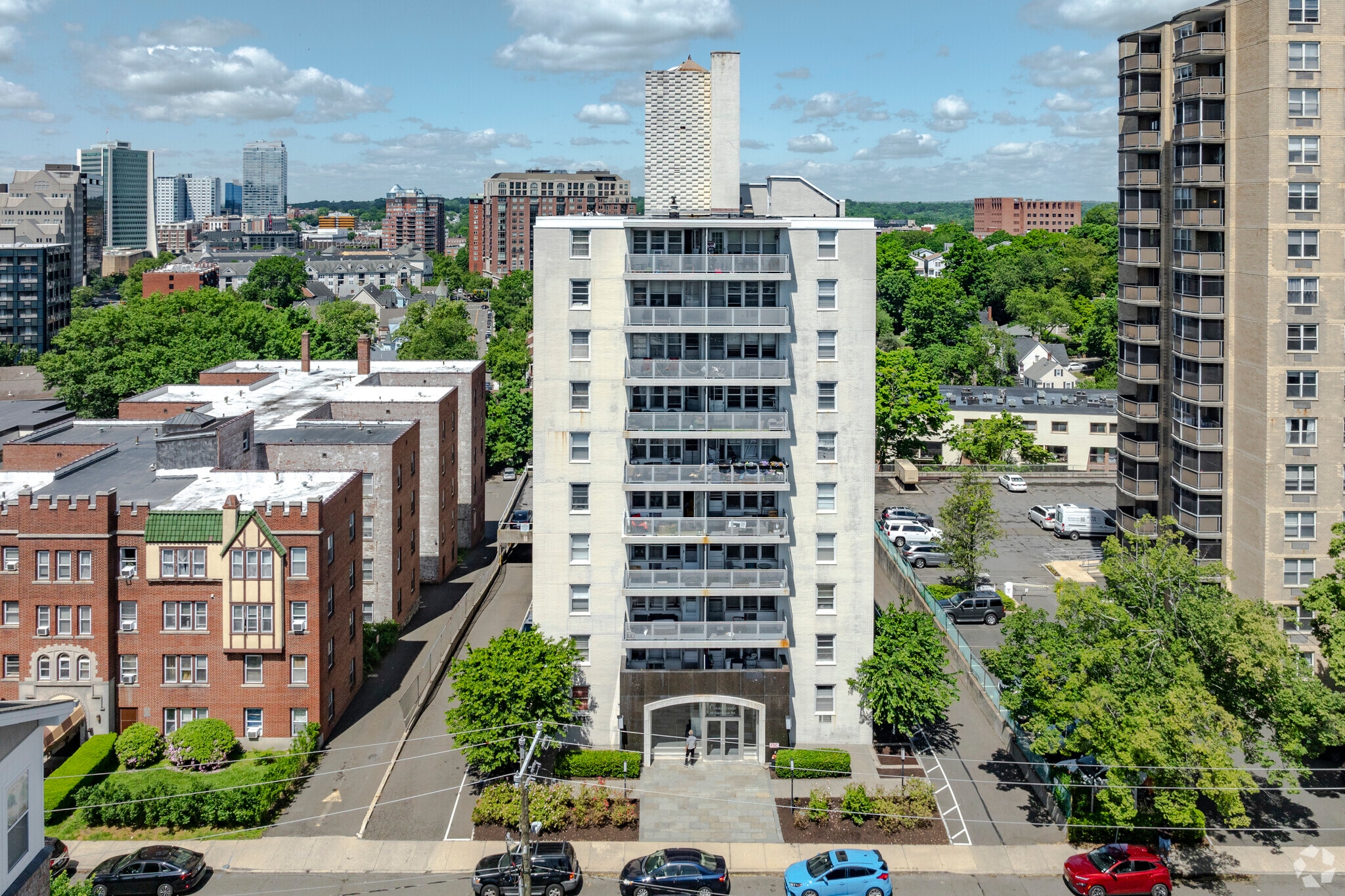 Crosswinds Condominiums, an 11-story high-rise completed in 1964, stands as a testament to midcentury modern design in the heart of downtown Stamford. With 67 units, this condominium offers a blend of urban convenience and residential comfort. The building's simple, symmetrical facade reflects the architectural ethos of its era, while its prime location puts residents at the center of Stamford's vibrant cityscape.