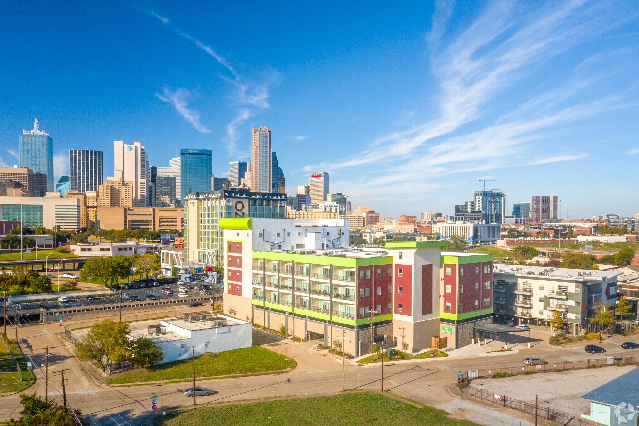 Destination Residences, designed with a contemporary flair, stands tall with its six stories of vibrant, colorful panels and expansive windows. Completed in 2021, this modern condominium building houses 62 units, offering a fresh and inviting atmosphere for residents. Located in the bustling Downtown Dallas neighborhood, the building's distinctive green-colored overhang adds a unique touch to its sleek design.