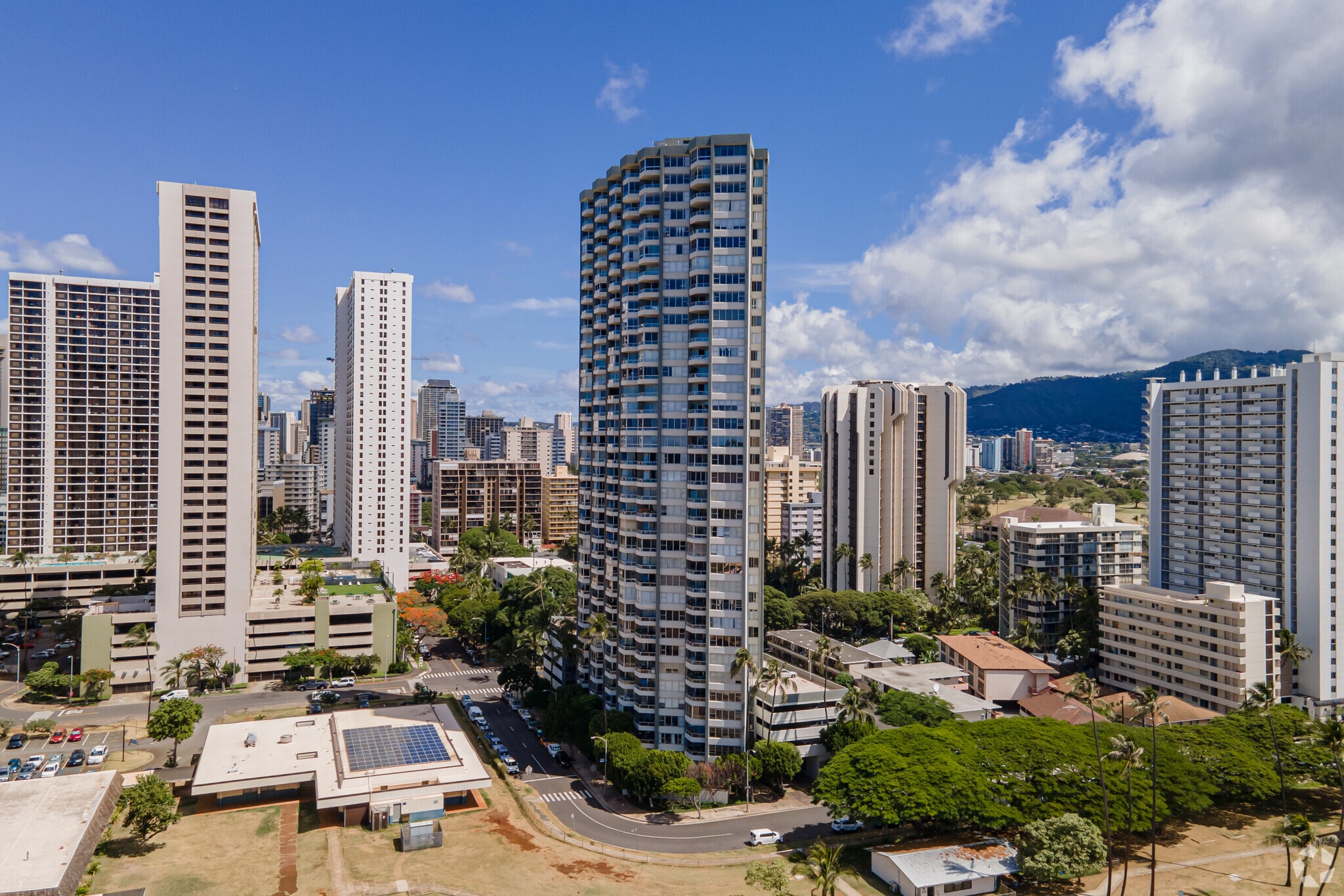 Diamond Head Vista stands as a prominent high-rise in Waikiki, completed in 1975. This 35-story building houses 173 units, offering a blend of modern convenience and island charm. Located at the serene Diamond Head end of Waikiki, it provides residents with stunning views of Diamond Head and the Pacific Ocean. The building's design is straightforward, focusing on functionality and comfort, making it a desirable choice for those seeking a home in this bustling neighborhood.