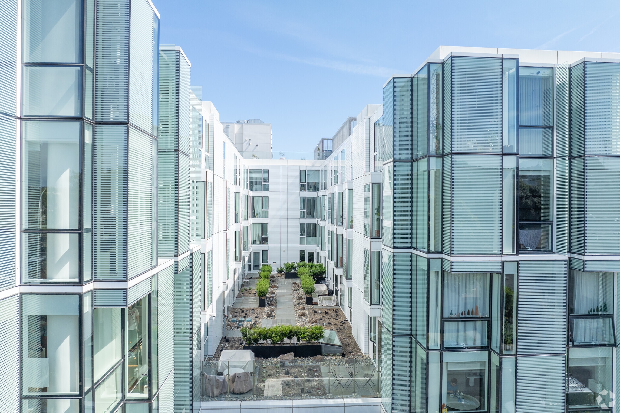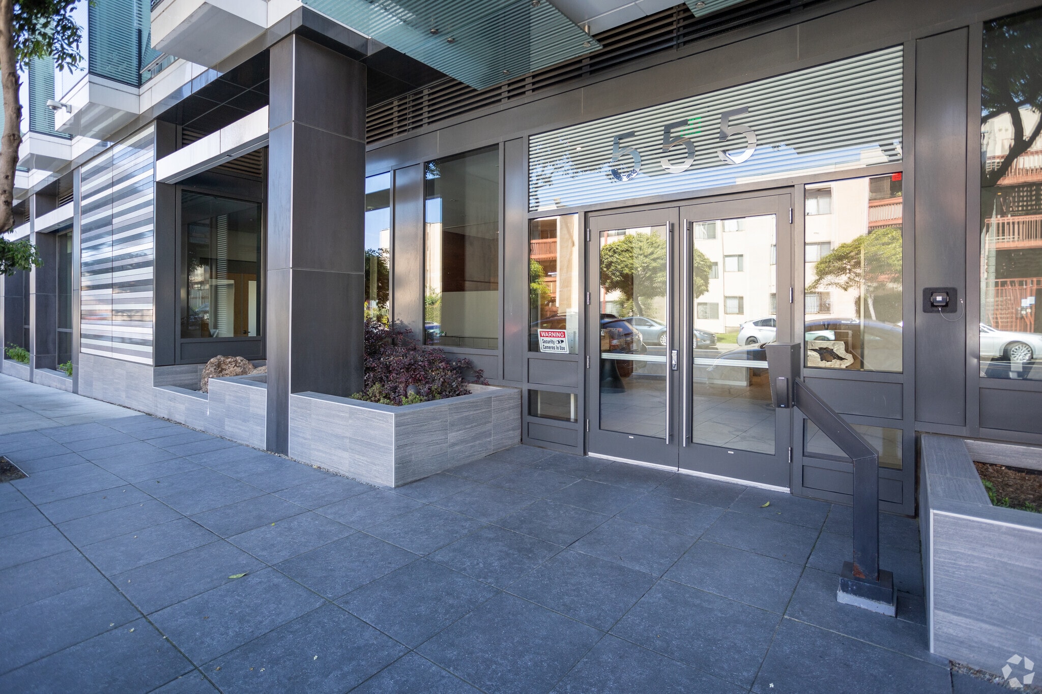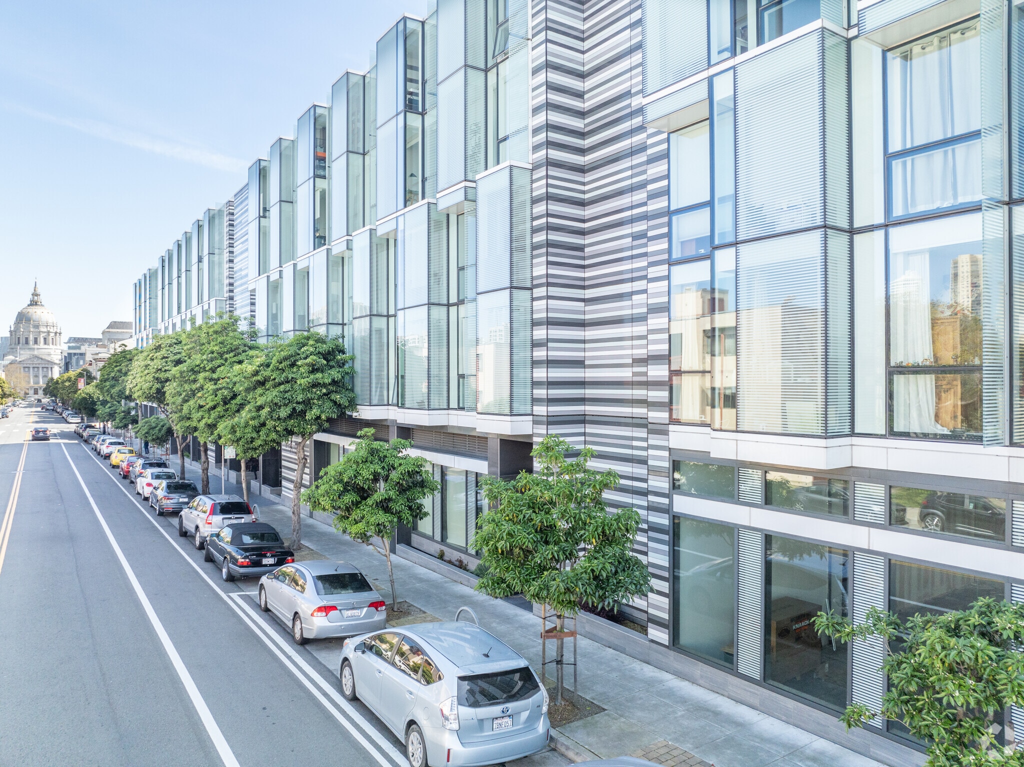 Fulton 555, designed by Ian Birchall & Associates, stands as a modern five-story condominium building completed in 2020. Located in the vibrant Hayes Valley neighborhood of San Francisco, this building comprises 140 units. The design features extensive use of glass on the facade, creating reflective surfaces that enhance the building's sleek, contemporary look. The central courtyard and horizontal metal paneling add texture and symmetry to the structure, making it a distinctive presence in the area.