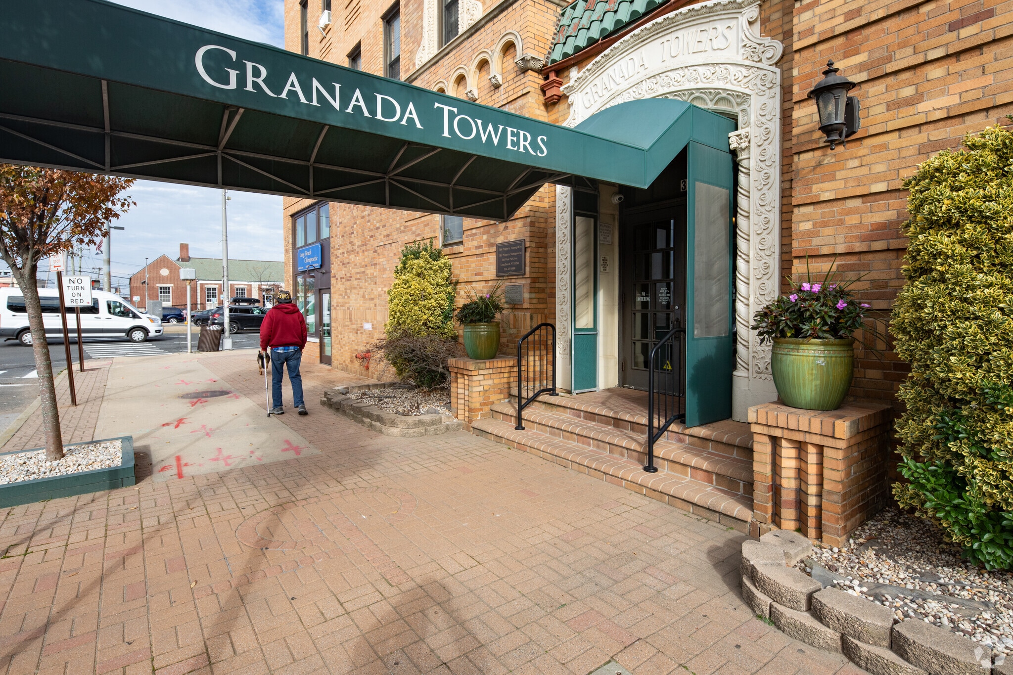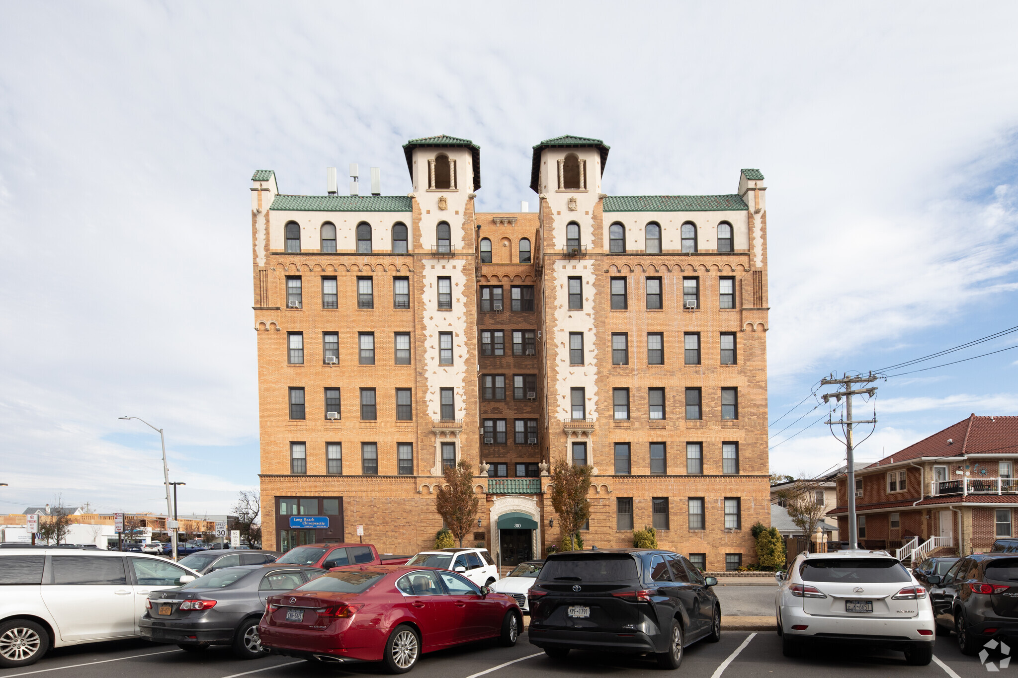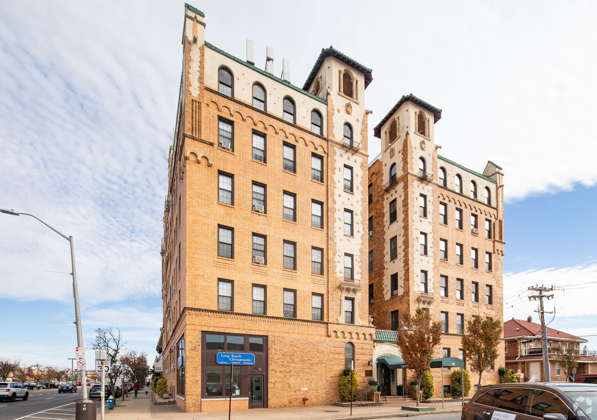 Granada Towers, a historic landmark in Long Beach, New York, stands as a testament to the enduring appeal of Gothic Revival architecture. Completed in 1928, this six-story condominium building houses 68 units, offering residents a blend of classic charm and modern convenience. The building's distinctive pointed arches and crenellated parapet give it a castle-like appearance, setting it apart from its neighbors in this vibrant oceanside community.