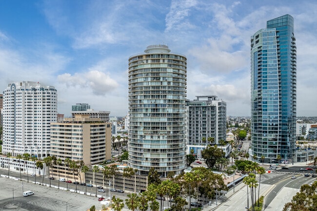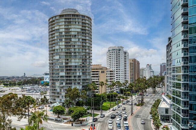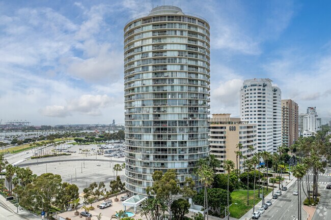 International Tower, designed by architect T.Y. Lin, stands as a prominent feature on the Long Beach skyline. Completed in 1966, this 27-story cylindrical high-rise is located at 700 E Ocean Blvd and houses 203 condominium units. Its unique round shape and glass facade, coupled with continuous wrap-around balconies, offer residents unobstructed views of the Pacific Ocean, Long Beach Harbor, and the cityscape. The building's mid-century modern design has made it a recognizable and often-photographed landmark in the area.