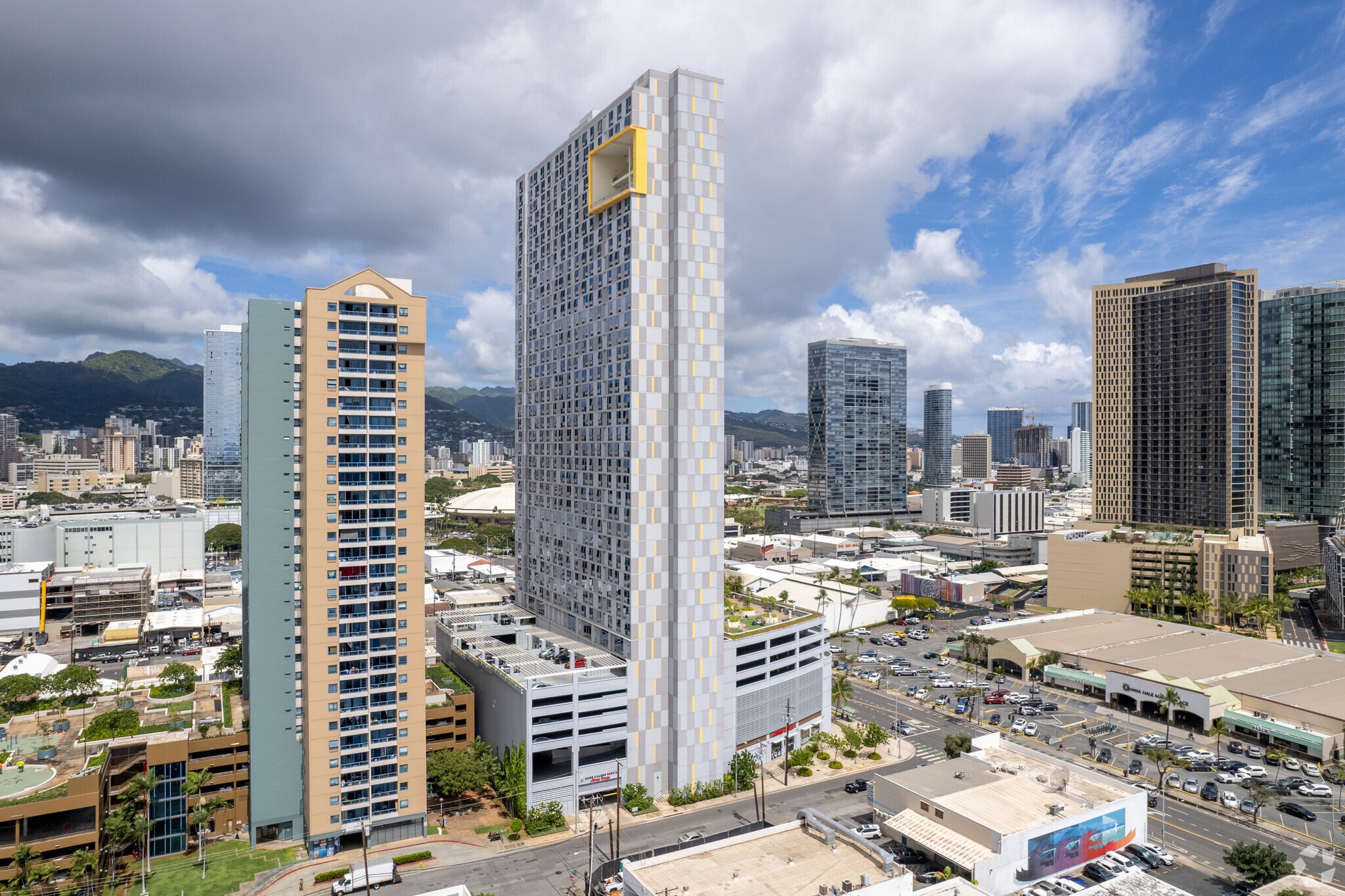 Ke Kilohana, designed by Togawa Smith Martin, Inc., is a contemporary 43-story condominium building completed in 2019. Located in the vibrant Ward Village of Downtown Honolulu, this high-rise offers 424 units, blending modern design with practical urban living. The building's grid-like facade, accented with a prominent yellow decorative element on its upper floors, adds a distinctive touch to the skyline. The base of the building includes a multi-story parking structure, ensuring convenience for residents.
