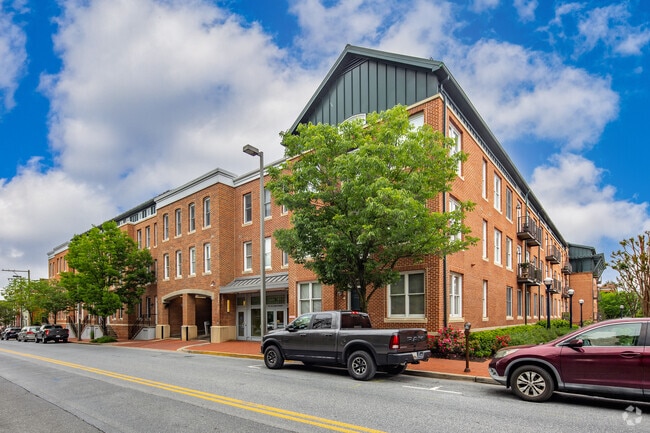 Maxwell Place is a four-story condominium building completed in 2007, located in the heart of downtown Frederick, Maryland. The building comprises 68 units and features a brick facade with large windows and a gabled metal roof, blending seamlessly with the historic charm of the surrounding area. The central archway and symmetrical design add to its distinctive appearance, making it a notable structure in the neighborhood.