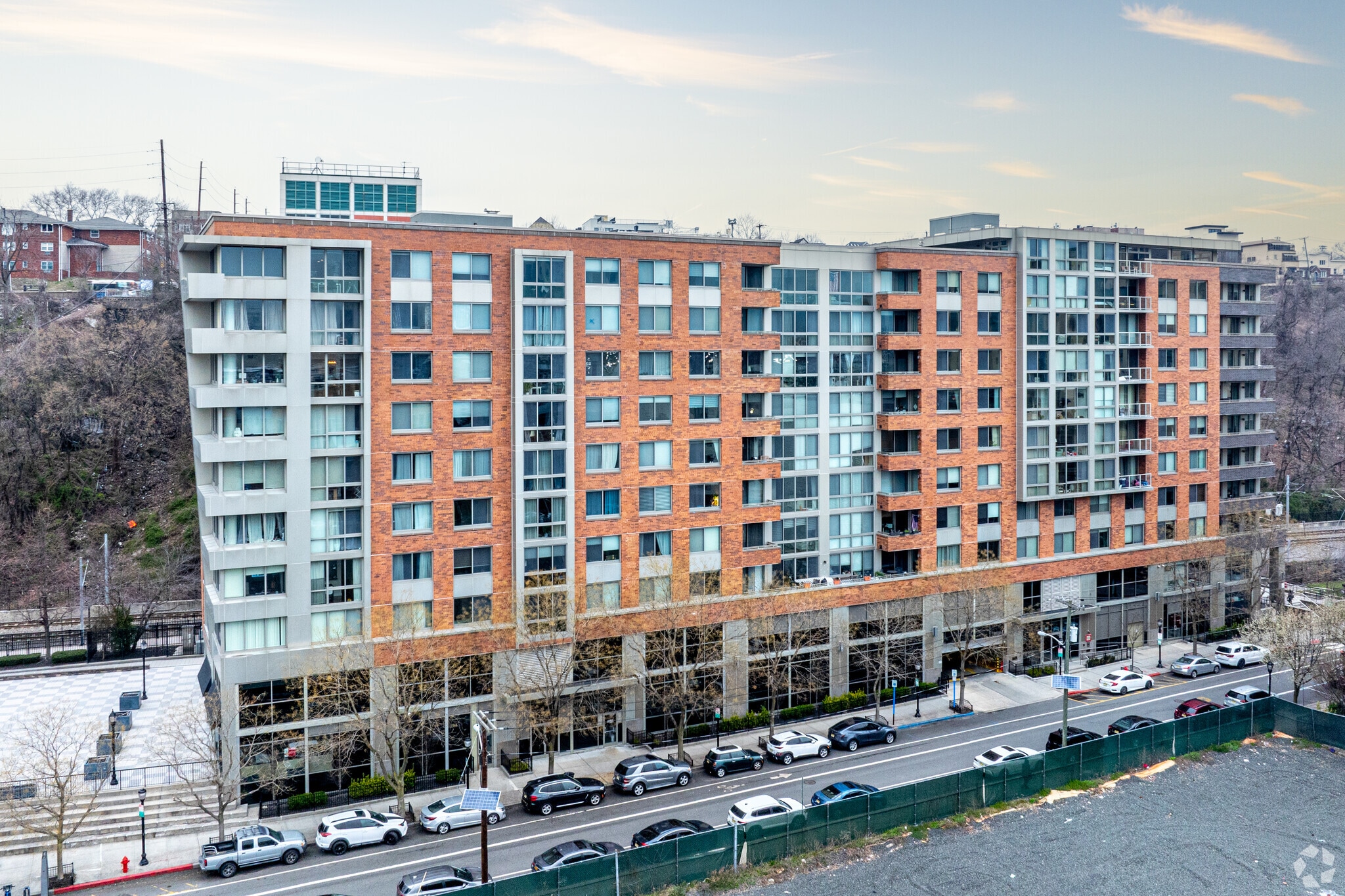 Metro Stop, an 11-story condominium completed in 2008, stands as a testament to contemporary urban living in Hoboken. Designed with a focus on sustainability and comfort, this steel and concrete structure houses 424 units, offering a range of living spaces from cozy studios to spacious three-bedroom residences. The building's exterior features a mix of brick and glass, with a distinctive curved corner showcasing a glass curtain wall. Situated in a prime location, Metro Stop provides residents with easy access to the vibrant Hoboken community while maintaining a sense of tranquility within its walls.