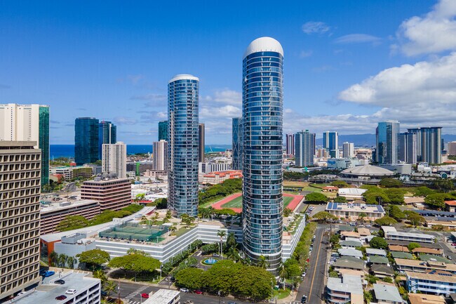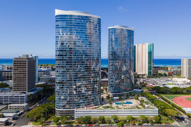 Moana Pacific stands as a prominent fixture in Honolulu's evolving Kaka'ako neighborhood. Completed in 2007 by architect Archinoetics Llc, this 48-story high-rise condominium complex houses 720 units across its twin towers. The building's curved facade and reflective glass windows create a striking silhouette against the Honolulu skyline. Situated just south of downtown and east of the Pacific Ocean, Moana Pacific offers residents a blend of urban convenience and island living, with easy access to shopping, dining, and outdoor recreation.