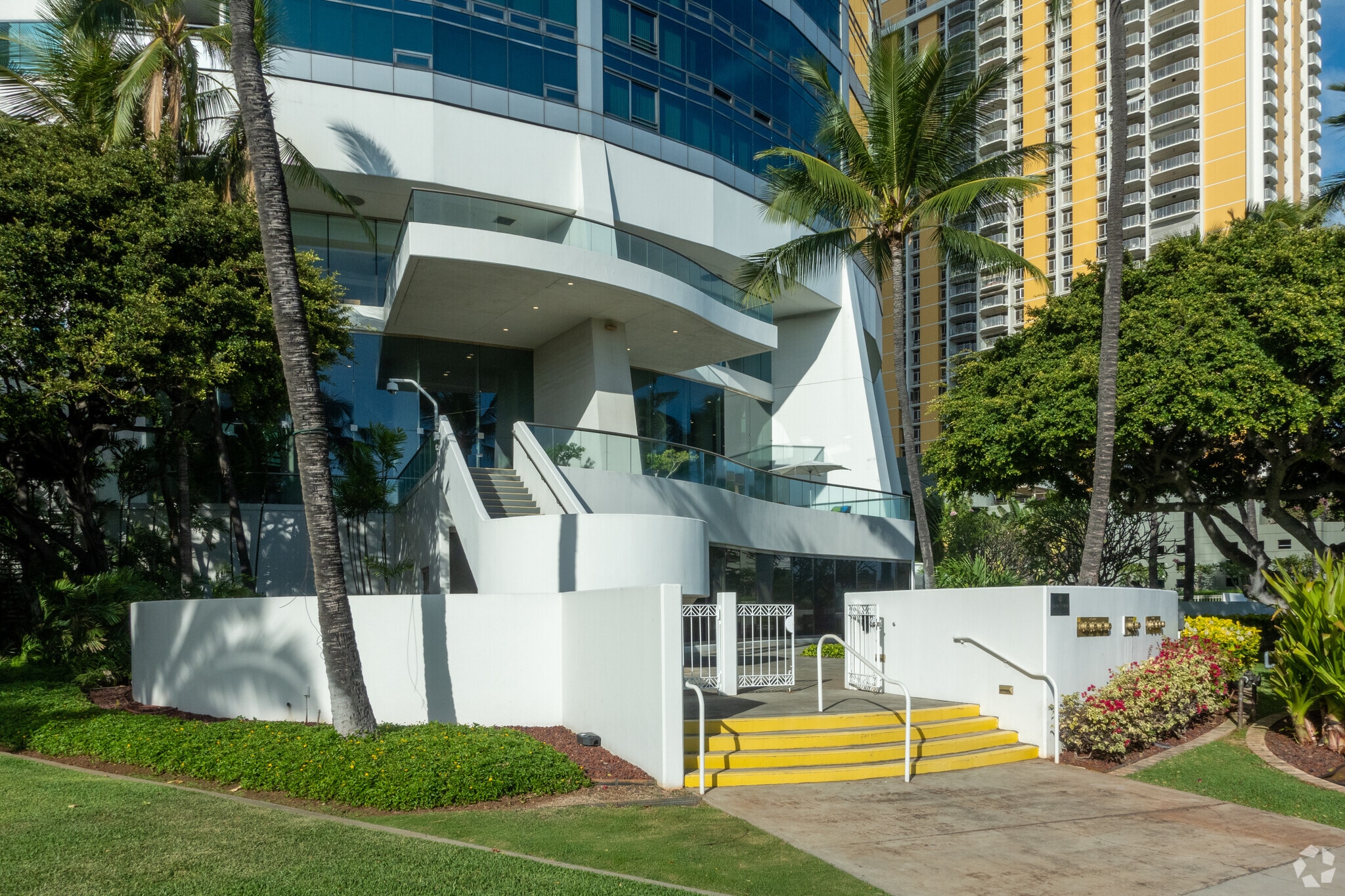 Nauru Tower, designed by Archinoetics LLC, stands as a 44-story modern architectural marvel in the heart of Kaka'ako, Honolulu. Completed in 1990, this high-rise features a distinctive cylindrical glass facade accentuated by horizontal white bands, creating a sleek and contemporary look. With 405 condo units, Nauru Tower offers residents a luxurious living experience with panoramic views of the Pacific Ocean and the vibrant cityscape.