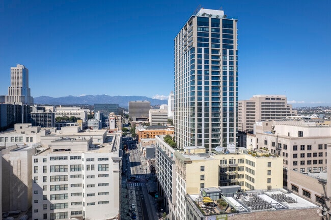 Perla, a 35-story condominium tower completed in 2021, stands as a modern landmark in the heart of Downtown Los Angeles' Historic Core. Designed by renowned architects CallisonRTKL, this striking high-rise offers 444 residences, blending contemporary luxury with the area's rich architectural heritage. The building's sleek glass facade and balconies create a sophisticated silhouette against the city skyline, while a rooftop garden and terrace provide residents with a serene urban oasis. Perla's prime location on Broadway puts residents at the epicenter of DTLA's cultural renaissance, offering a unique opportunity to be part of the neighborhood's vibrant transformation.