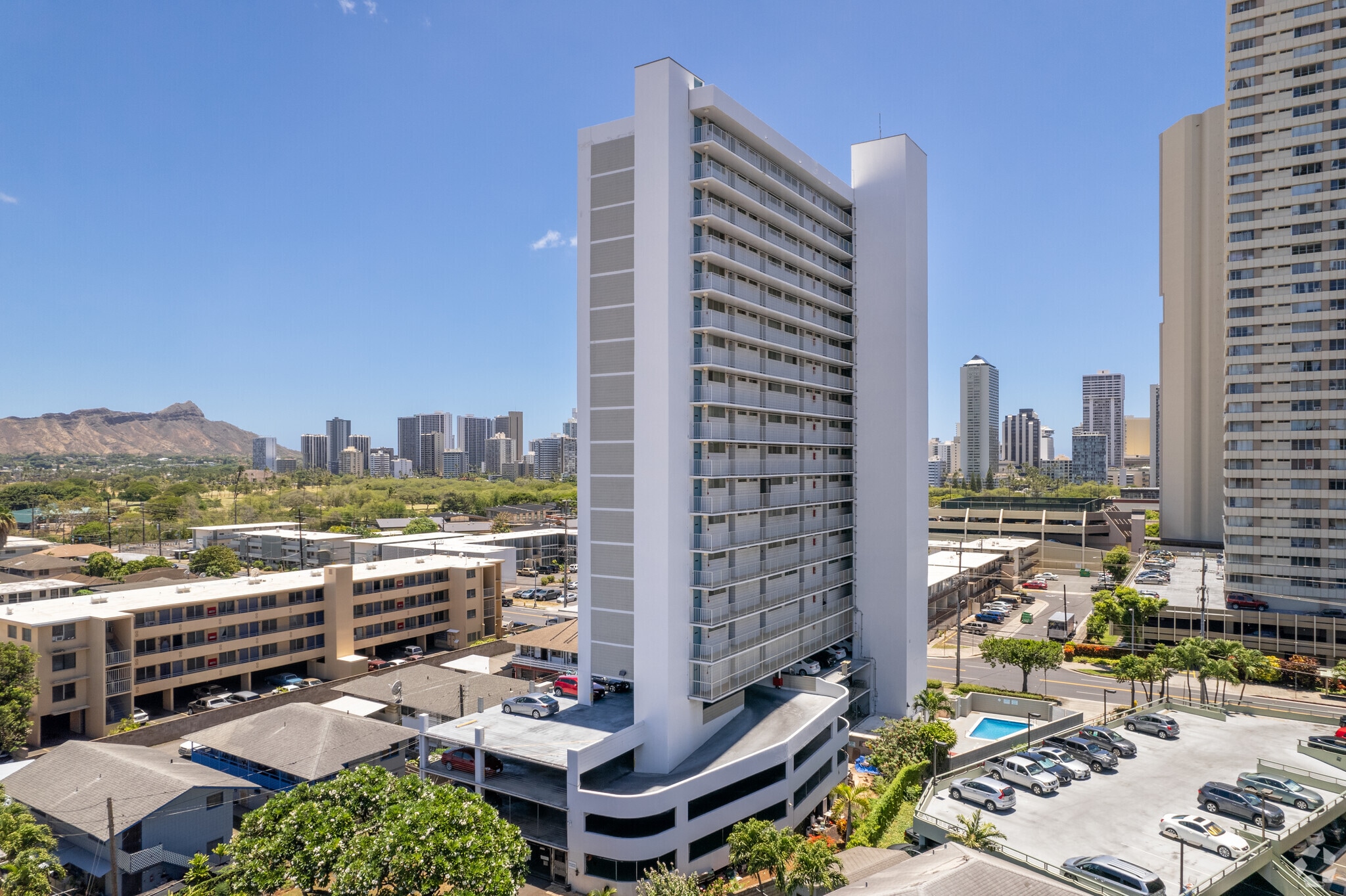 The Plaza at Century Court, a 20-story high-rise completed in 1981, stands as a fixture in the vibrant McCully-Mō'ili'ili neighborhood of Honolulu. This condominium complex houses 97 units, offering residents a blend of urban convenience and island charm. Its location provides stunning views of Diamond Head and the Ala Wai Golf Course, while positioning residents just minutes away from the bustling heart of Waikiki and downtown Honolulu. The building's simple, functional design features a grid-like pattern of windows and balconies, allowing ample natural light and fresh island breezes to permeate the living spaces.