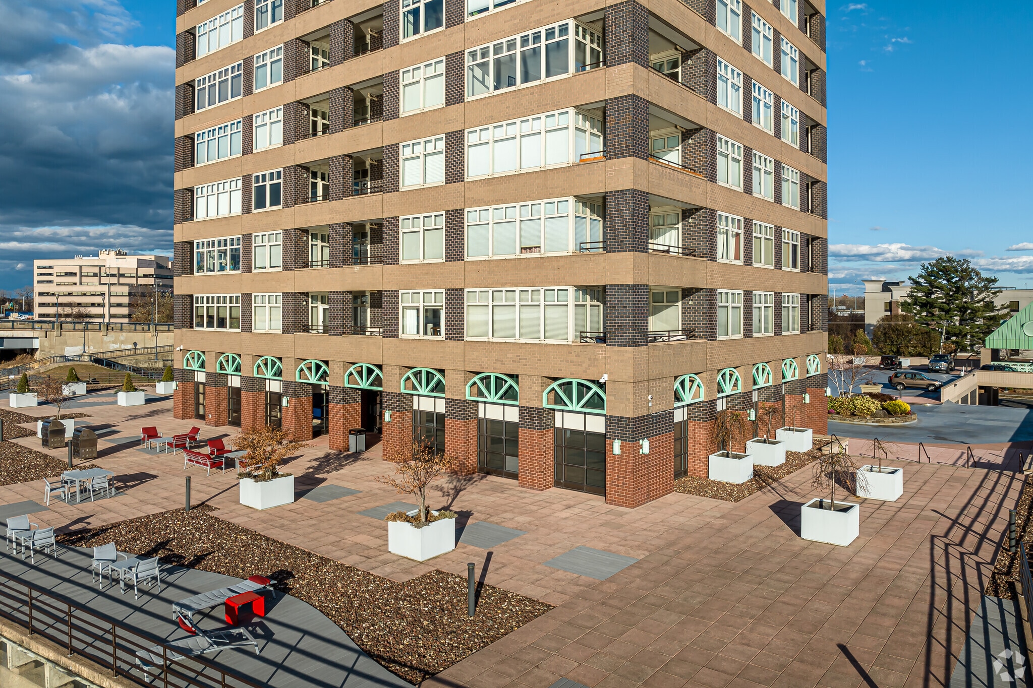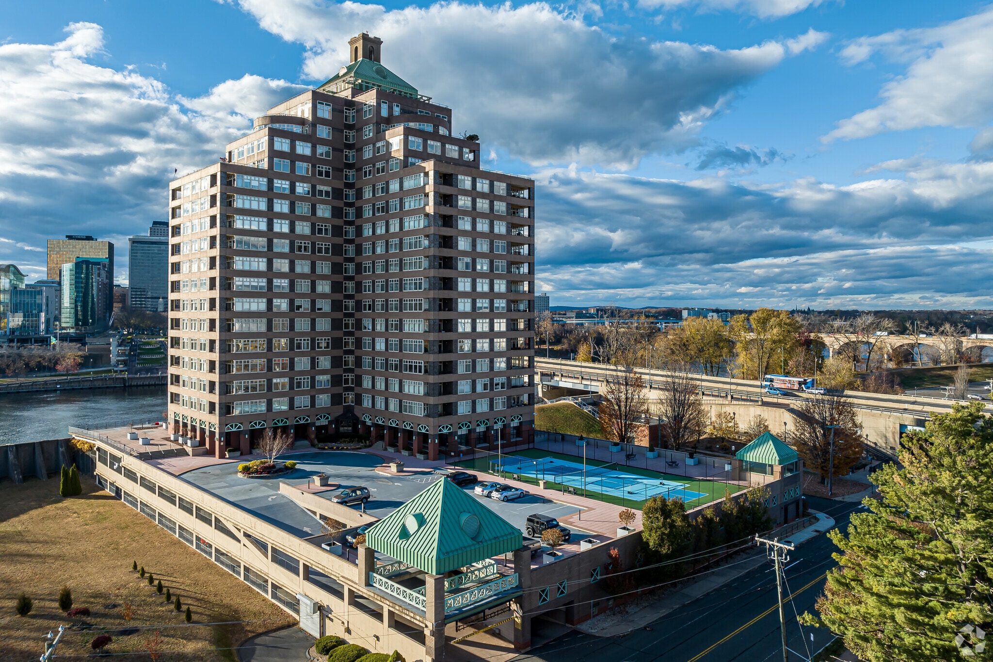 Riverpoint on the Connecticut is a 20-story condominium building completed in 1989, located across the Connecticut River from downtown Hartford. With 103 units, this high-rise offers residents a blend of urban convenience and serene riverfront living. The building's symmetrical facade is accentuated by a series of balconies and a distinctive green, pyramidal roof structure at its pinnacle, making it a notable landmark in the area.