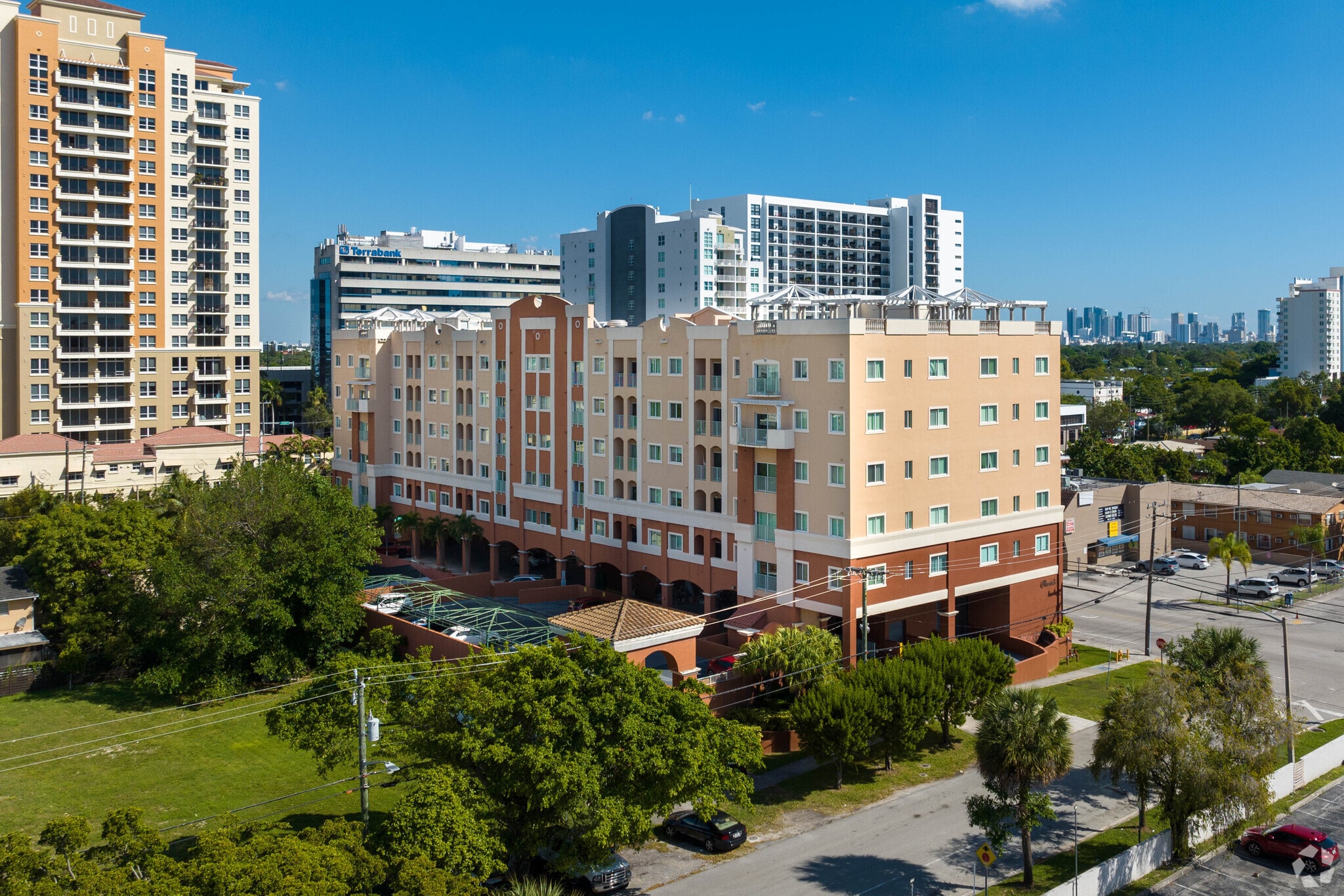 Shamrock Coral Gables is a six-story condominium building located in the vibrant Coral Way neighborhood of Miami. Completed in 2004, this building features 80 units and offers a blend of modern conveniences and a prime location. The building's stucco facade and arched windows on the upper floors give it a distinctive look, while the covered parking area on the ground level adds to its functionality.