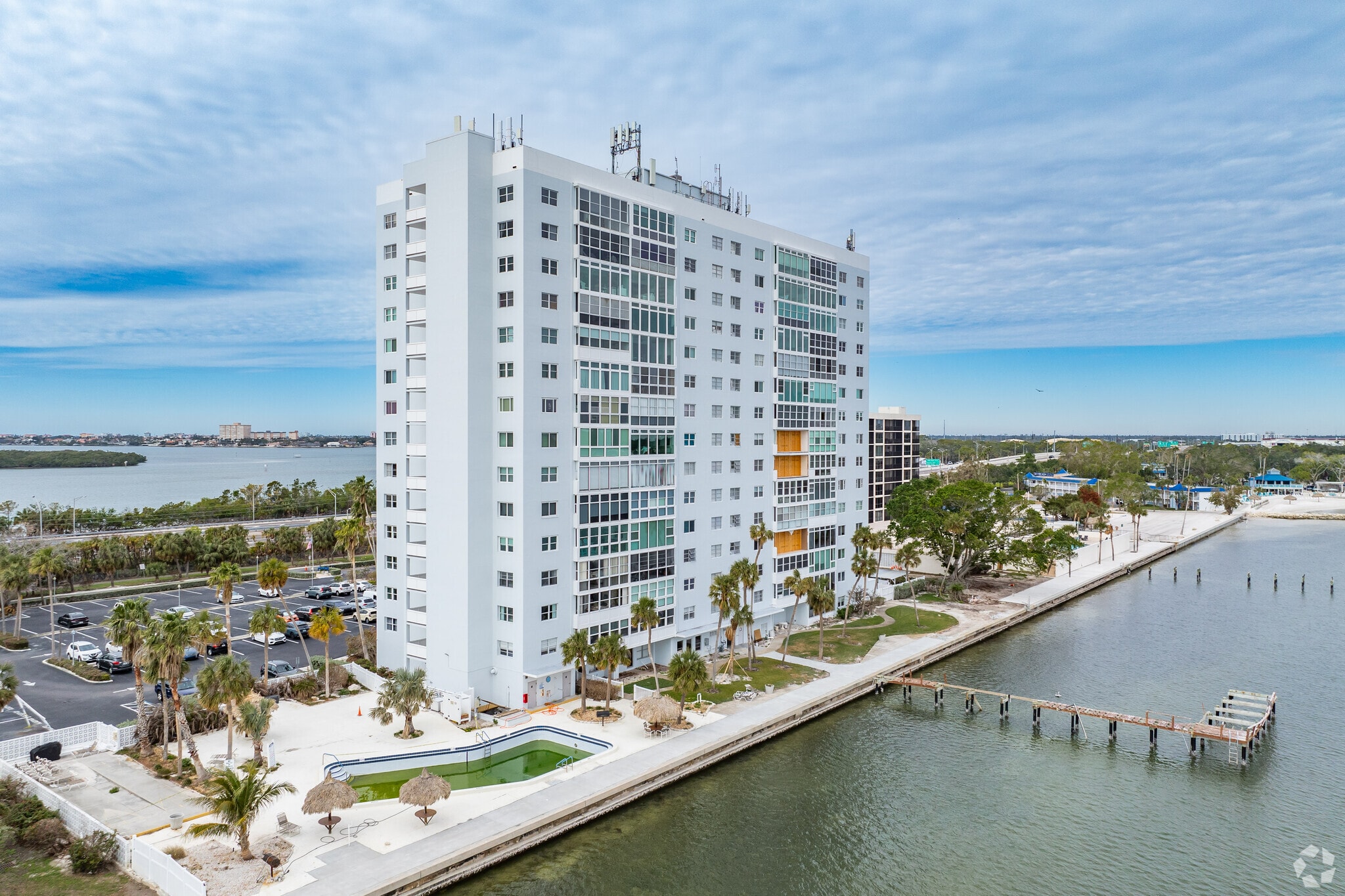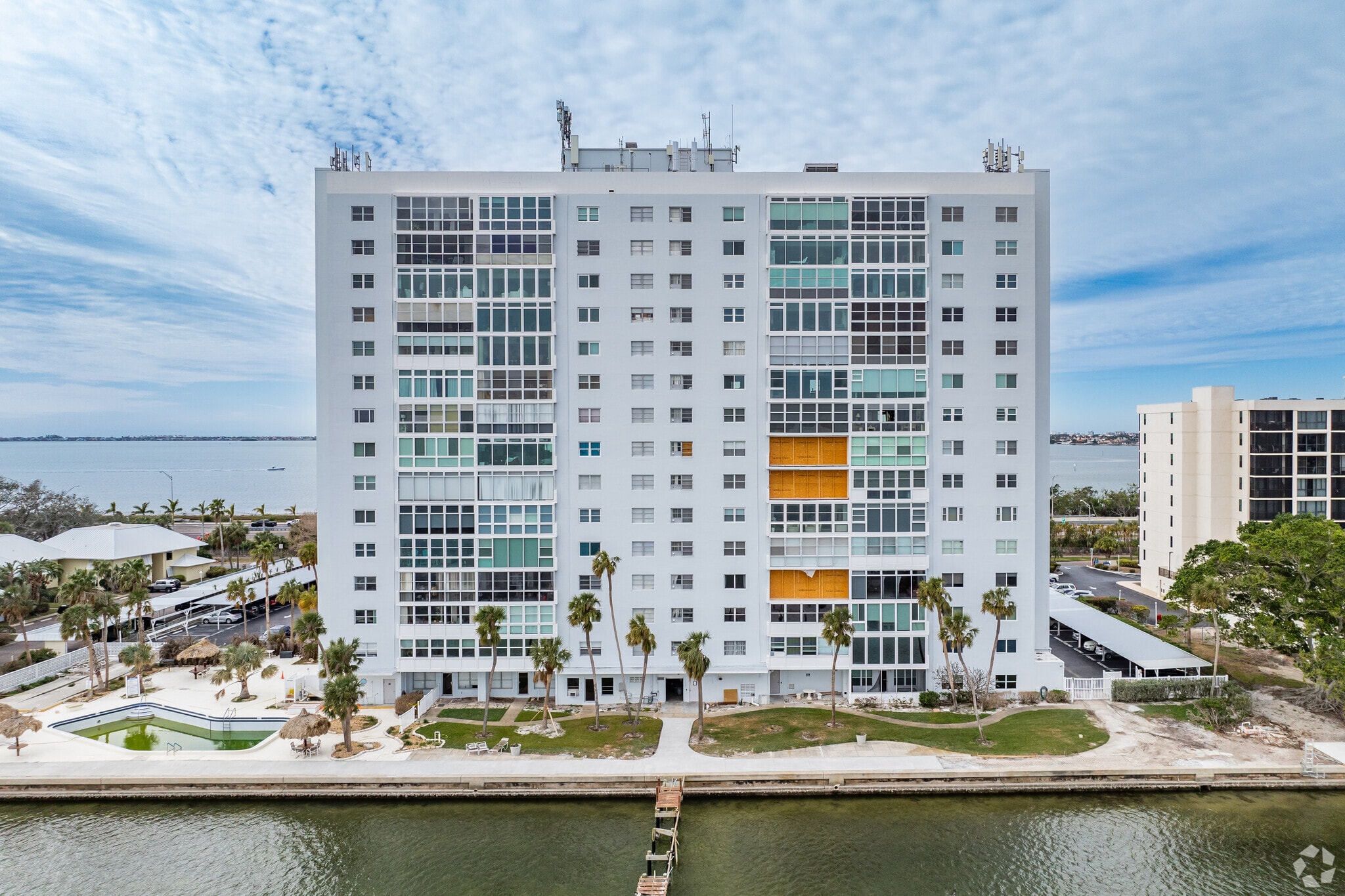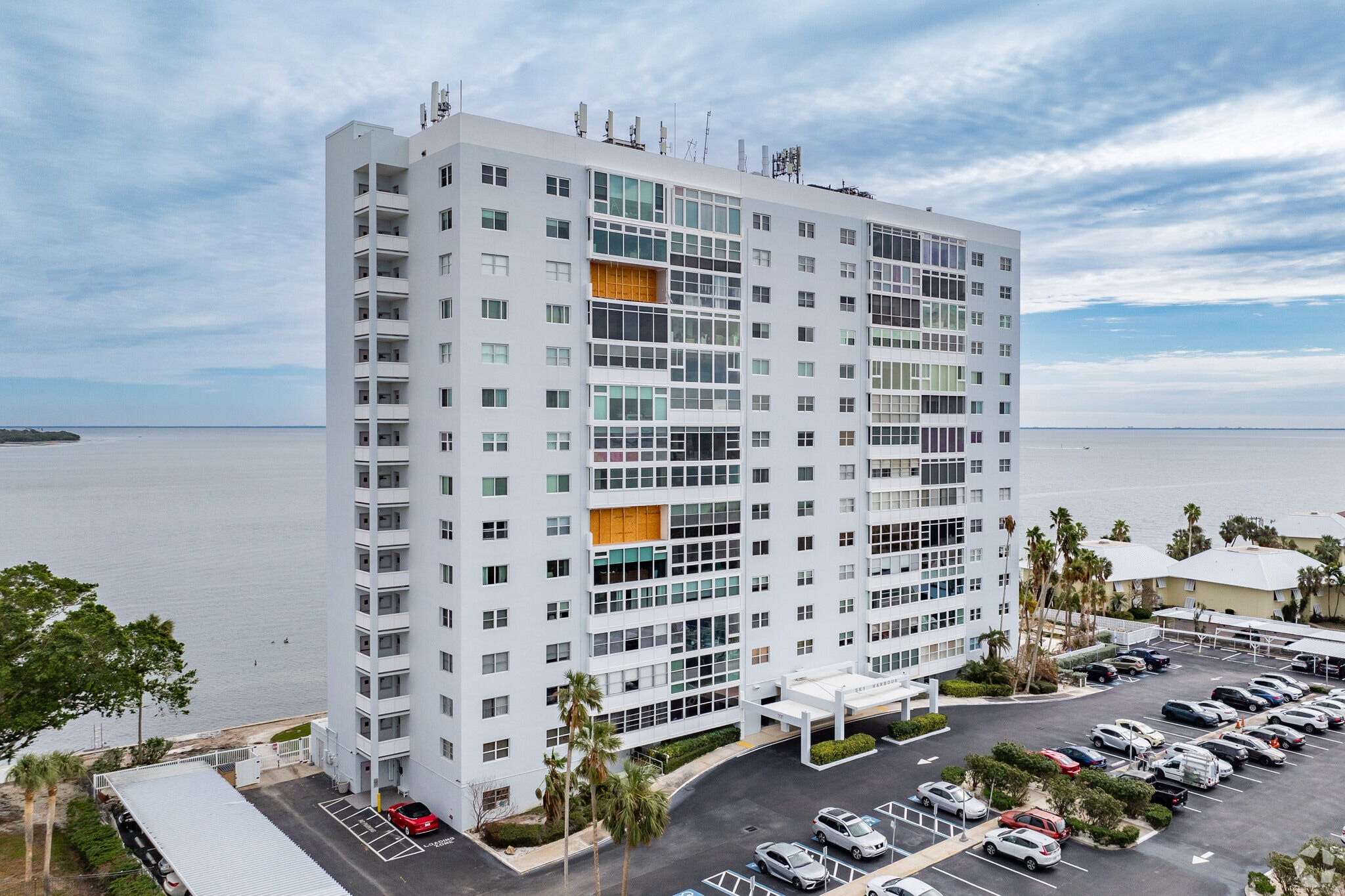 Sky Harbour, constructed in 1963, stands as a 14-story condominium complex in the Greater Pinellas Point neighborhood of St. Petersburg, Florida. The building, comprising 113 units, offers residents breathtaking views of Tampa Bay, the Sunshine Skyway Bridge, and the St. Petersburg skyline. Built by the Army Corps of Engineers, Sky Harbour is known for its sturdy construction and prime location on the waterfront, providing residents with a blend of coastal living and urban convenience.