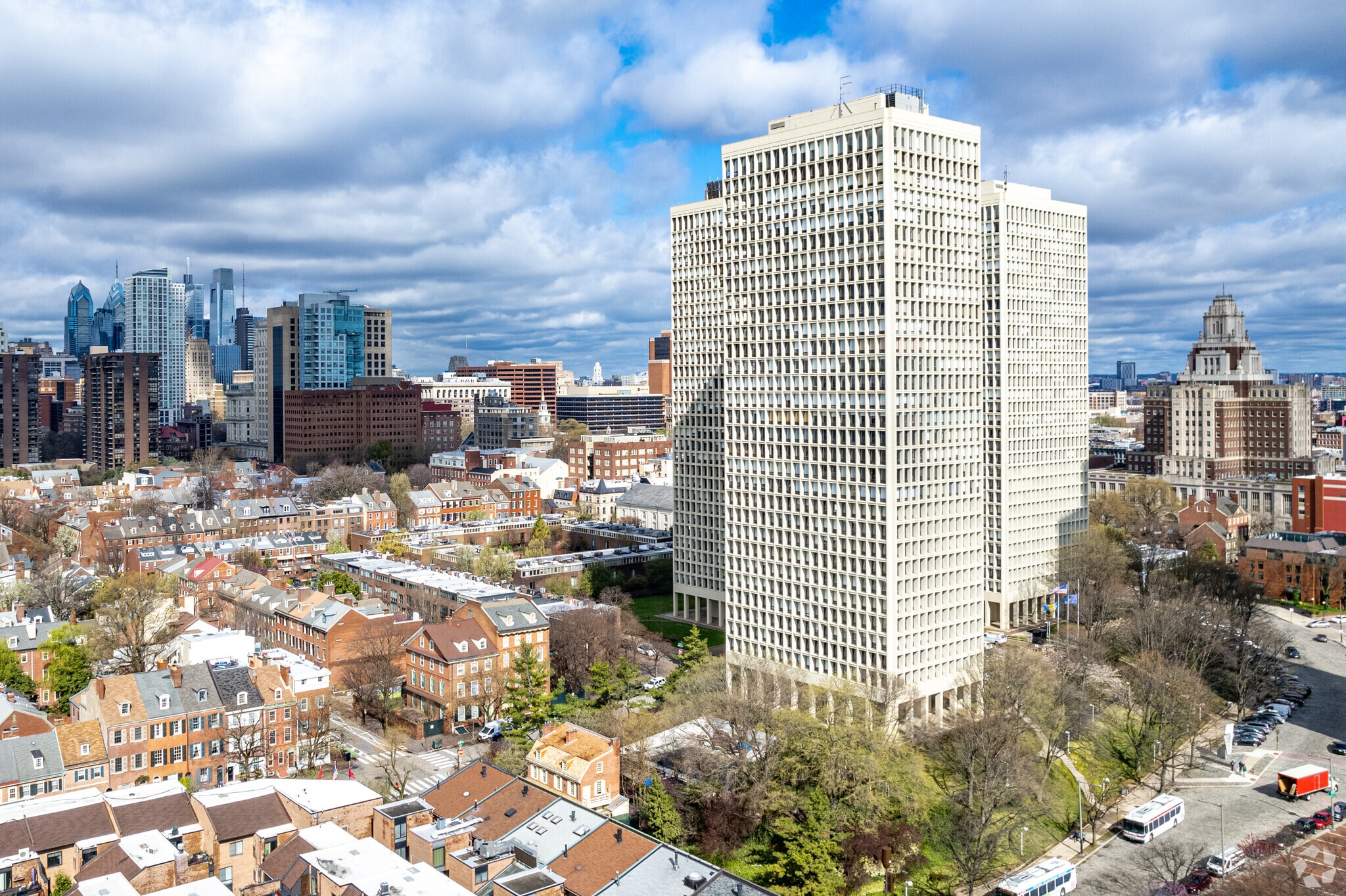 Society Hill Towers, designed by the renowned architect I.M. Pei, stands as a prominent feature in Philadelphia's historic Society Hill neighborhood. Completed in 1963, this 32-story high-rise comprises 625 condominium units. The building's location offers residents a blend of colonial charm and modern conveniences, with easy access to some of the city's most significant historical landmarks and vibrant urban amenities.