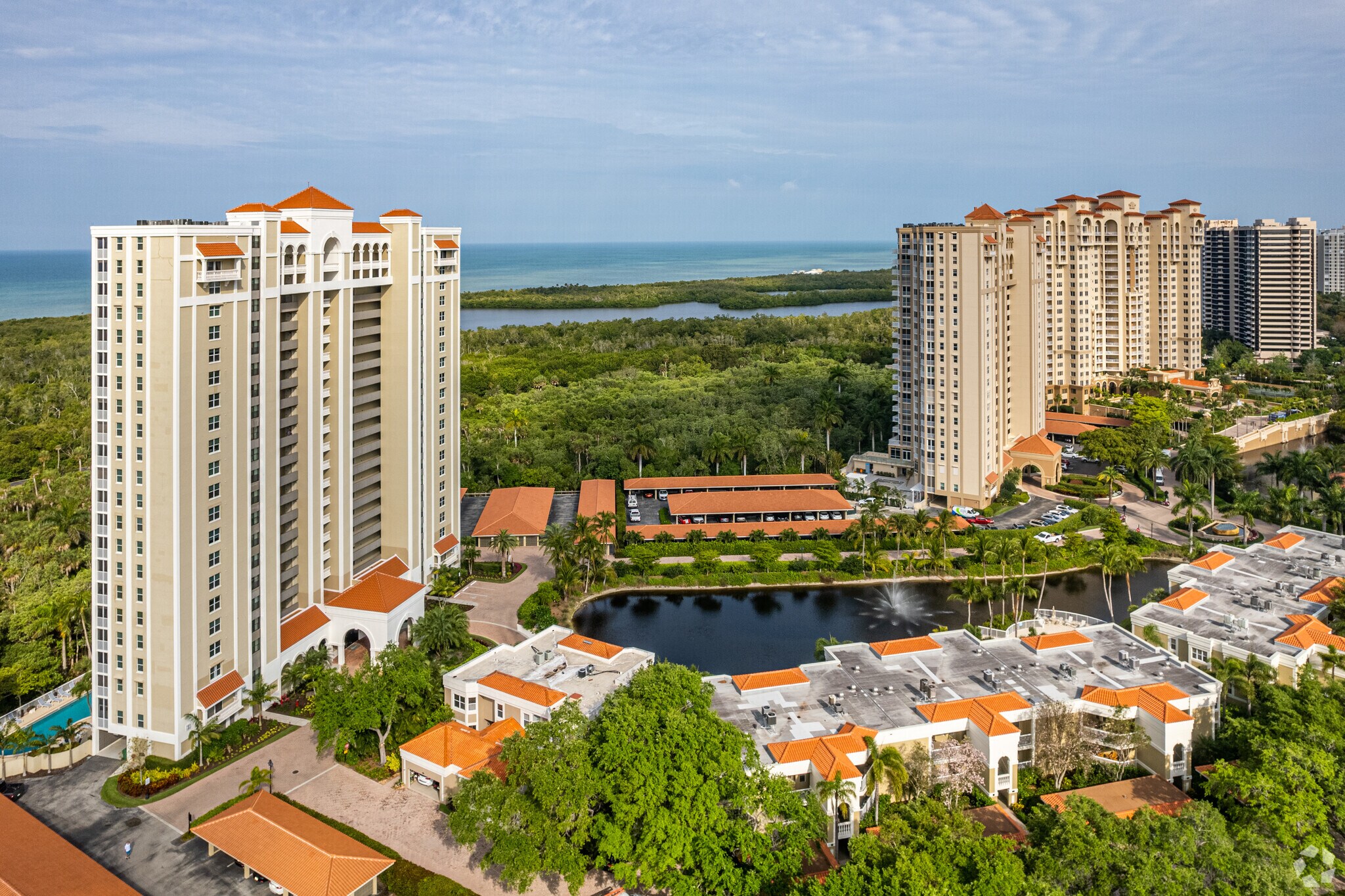 St. Marissa Condominium, a 22-story high-rise completed in 1992, stands as a prominent fixture in Naples' prestigious Pelican Bay community. This elegant tower houses 97 units, offering residents a blend of sophisticated living and breathtaking Gulf of Mexico views. Situated within the gated Crown Colony subdivision, St. Marissa provides an exclusive retreat for those seeking a premium coastal lifestyle. The building's design emphasizes panoramic vistas, with many units boasting expansive balconies and floor-to-ceiling windows that frame the stunning sunsets and lush mangrove preserves below.