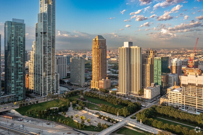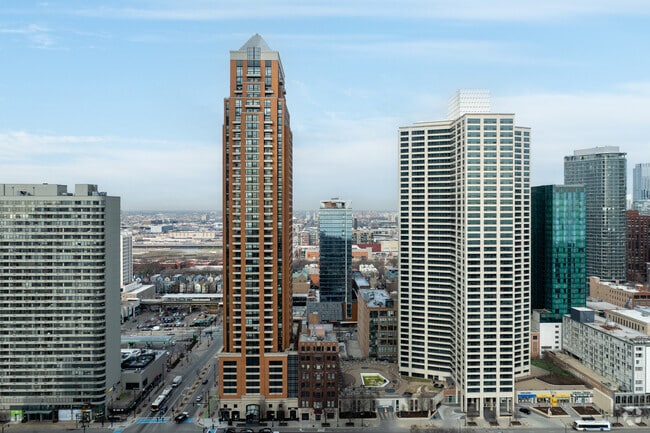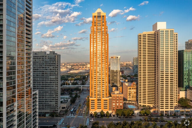 The Columbian stands tall at 46 stories, offering a contemporary living experience in Chicago's vibrant South Loop. Completed in 2007, this high-rise features 225 units and showcases a striking vertical design with a mix of glass and terracotta-colored materials. Its prominent location on Michigan Avenue provides residents with breathtaking views of Lake Michigan and Grant Park, making it a sought-after address for those who appreciate urban living with a touch of elegance.