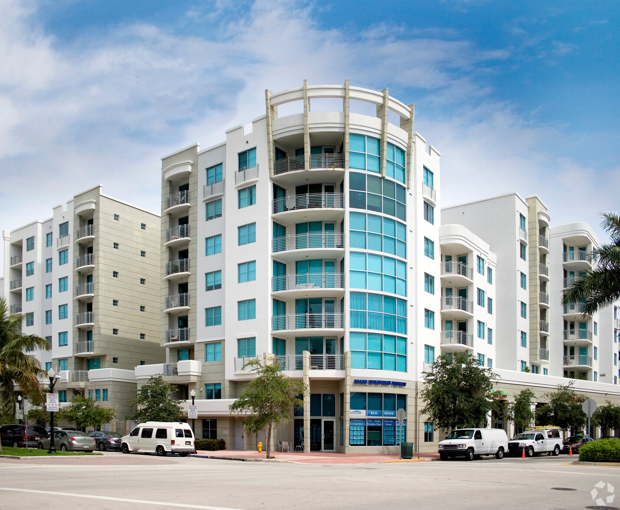 The Cosmopolitan stands as a sophisticated residential landmark in Miami Beach's exclusive South of Fifth neighborhood. Completed in 2004, this eight-story condominium offers 234 units of refined living just blocks from the Atlantic shoreline. The building's contemporary design features a curved façade with prominent glass elements, creating a striking silhouette against the vibrant South Beach skyline. Residents of The Cosmopolitan enjoy a prime location that seamlessly blends the tranquility of beachside living with the energy of one of Miami's most sought-after districts.